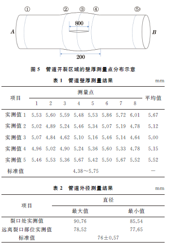 使用超声波测厚仪对开裂管道的壁厚进行测量。管道开裂区域的壁厚测量点如图5所示,由A~B端取5个剖面进行壁厚测量,每个剖面沿周向取8个测量点,测量结果如表1所示。由表1可知:远离开裂部位的管道平均壁厚为5.52~5.67mm,最小壁厚为5.36 mm。开裂所在的鼓胀区平均壁厚为5.00~5.15mm,最小壁厚为4.62mm。分别测量管体鼓胀区及远离开裂部位管道的外径,结果如表2所示。管道壁厚及管径测量结果表明,裂口位置发生了明显的塑性变形及壁厚减薄。