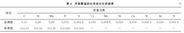 (1) 开裂管道正常部位的外防腐层检测、几何尺寸测量、化学成分分析、拉伸试验、维氏硬度测试、抗氢致开裂试验、抗硫化物应力腐蚀试验结果均符合SY/T 0315—2013和GB/T 9711—2017标准要求。