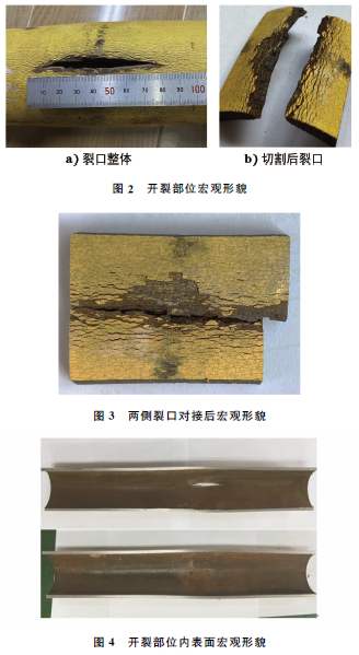 开裂管道规格为76mm×5mm(外径×壁厚),送检的管段长度为930mm,开裂处位于管段中部,沿纵向开裂,开裂口纵向长度为80mm,最大张开宽度为7mm,开裂处存在轻微鼓胀变形(见图1),并可见壁厚减薄,且呈45°剪切特征(见图2)。裂口周围的防腐层破损脱落,其余部位的防腐层呈龟裂形貌。因裂口两侧管体发生塑性变形,故两侧断口无法完全对接(见图3)。将开裂部位的管体纵向剖开,发现管体内表面呈红褐色,有均匀的腐蚀形貌(见图4)。