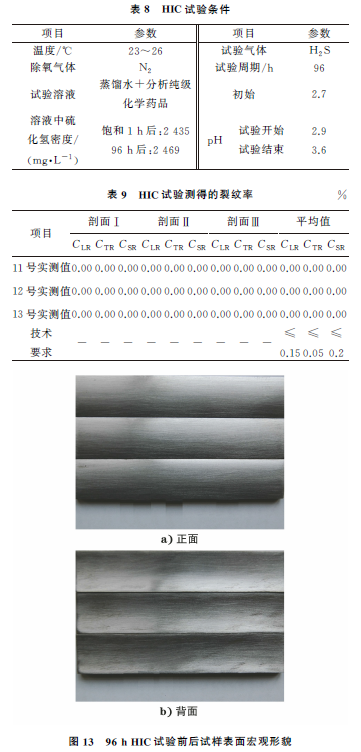 从远离开裂部位的管道上截取纵向试样,尺寸(长×宽×厚)为100mm×20mm×5mm,依据GB/T 8650—2015 《管线钢和压力容器钢抗氢致开裂评定方法》进行抗氢致开裂(HIC)试验,试验条件如表8所示,试验结果如表9所示(表中CSR为裂纹敏感率,CLR为裂纹长度率,CTR为裂纹厚度率),96hHIC试验前后试样表面的宏观形貌如图13所示。试验结果符合GB/T 9711—2017标准要求。