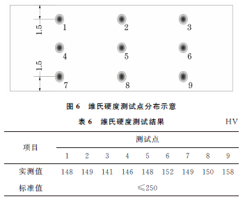 从远离开裂部位的管道处截取试样,使用维氏硬度计测试管道的维氏硬度,在试样外表面、中间、内表面3个部分分别测试3个点(见图6),测试结果如表6所示。硬度测试结果表明:材料硬度符合GB/T 9711—2017标准要求。