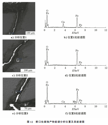 对开裂断口处的腐蚀产物进行能谱分析,其主要成分有Fe、C、O、Ca、Mn元素等(见图12)。