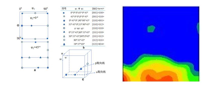 • 1928 – Kikuchi – 最早报告了电子背散射衍射花样 EBSDP • 1972 – Venables et. al. – 在SEM中得到了EBSDP • 1982 – Dingley – 计算机辅助指标化 • 1991 – Wright et. al. – 全自动EBSD系统 • 1993 – Michael et. al. – 相鉴定 Phase ID • 2000s – TSL – 化学辅助相鉴定 Chemically assisted phase differentiation20世纪90年代以来,装配在SEM上的电子背散射花样(Electron Back-scattering Patterns,简称EBSP)晶体微区取向和晶体结构的分析技术取得了较大的发展,并已在材料微观组织结构及微织构表征中广泛应用。该技术也被称为电子背散射衍射(Electron Backscattered Diffraction,简称EBSD)或取向成像显微技术(Orientation Imaging Microscopy,简称OIM) 等。EBSD的主要特点是在保留扫描电子显微镜的常规特点的同时进行空间分辨率亚微米级的衍射(给出结晶学的数据)。EBSD改变了以往织构分析的方法,并形成了全新的科学领域,称为“显微织构”—将显微组织和晶体学分析相结合。与“显微织构”密切联系的是应用EBSD进行相分析、获得界面(晶界)参数和检测塑性应变。目前,EBSD技术已经能够实现全自动采集微区取向信息,样品制备较简单,数据采集速度快(能达到约36万点/小时甚至更快),分辨率高(空间分辨率和角分辨率能分别达到0.1m和0.5m),为快速高效的定量统计研究材料的微观组织结构和织构奠定了基础,因此已成为材料研究中一种有效的分析手段。目前EBSD技术的应用领域集中于多种多晶体材料—工业生产的金属和合金、陶瓷、半导体、超导体、矿石—以研究各种现象,如热机械处理过程、塑性变形过程、与取向关系有关的性能(成型性、磁性等)、界面性能(腐蚀、裂纹、热裂等)、相鉴定等。系统设备的基本要求是一台扫描电子显微镜和一套EBSD系统。EBSD采集的硬件部分通常包括一台灵敏的CCD摄像仪和一套用来花样平均化和扣除背底的图象处理系统。图1是EBSD系统的构成及工作原理。在扫描电子显微镜中得到一张电子背散射衍射花样的基本操作是简单的。相对于入射电子束,样品被高角度倾斜,以便背散射(即衍射)的信号EBSP被充分强化到能被荧光屏接收(在显微镜样品室内),荧光屏与一个CCD相机相连,EBSP能直接或经放大储存图象后在荧光屏上观察到。只需很少的输入操作,软件程序可对花样进行标定以获得晶体学信息。目前最快的EBSD系统每一秒钟可进行近100个点的测量。现代EBSD系统和能谱EDX探头可同时安装在SEM上,这样,在快速得到样品取向信息的同时,可以进行成分分析。利用从样品表面反弹回来的高能电子衍射,得到一系列的菊池花样。根据菊池花样的特点得出晶面间距d和晶面之间的夹角θ,从数据库中查出可能的晶体结构和晶胞参数。再利用化学成分等信息采用排除法确定该晶粒的晶体结构。并得出晶粒与膜面法向的取向关系。扫描电子显微镜中电子背散射衍射技术已广泛地成为金属学家、陶瓷学家和地质学家分析显微结构及织构的强有力的工具。EBSD系统中自动花样分析技术的发展,加上显微镜电子束和样品台的自动控制使得试样表面的线或面扫描能够迅速自动地完成,从采集到的数据可绘制取向成像图OIM、极图和反极图,还可计算取向(差)分布函数,这样在很短的时间内就能获得关于样品的大量的晶体学信息,如:织构和取向差分析;晶粒尺寸及形状分布分析;晶界、亚晶及孪晶界性质分析;应变和再结晶的分析;相签定及相比计算等,EBSD对很多材料都有多方面的应用也就是源于EBSP所包含的这些信息。EBSD不仅能测量各取向在样品中所占的比例,还能知道这些取向在显微组织中的分布,这是织构分析的全新方法。多晶材料在轧制变形或凝固生长等条件下,晶粒取向集中分布在某一或某些取向附近,多晶体的这种择优取向称为织构。织构的三种表示方法:1)极图(PF) 2)反极图(IPF) 3)取向分布函数图(ODF)极图和反极图是用二维图形来描述三维空间取向分布,存在局限性。而采用ODF图可以表达整个空间的取向分布,所以用一系列ODF截面图来判断织构类型,信息更全面。极图表示法中,以轧向RD、横截面方向TD和轧面法线ND为参考坐标系,然后以轧面作为投影面,作出各晶粒某晶面{hkl}在参考球球面上极点,将极点在球面上的加权密度分布进行赤道投影,就称为{hkl}极图。左图与标准图对比,可知该样品中有较强的Brass织构反极图的表示方法与极图刚好相反,以晶体坐标系的[100]、[010]、[001]为参考坐标系,将RD(或TD、ND)方向进行极密度投影。该材料经过退火后出现强的{110}//ND 和{111}//RD织构,次强的{101}//RD 织构。为了便于分析和对比,常常把所选取的取向空间特定截面上的取向分布函数值以等密度线的形式绘在平面图上,以便研究织构演变问题。面心立方金属轧制织构都处在欧拉取向空间的φ2为45°等截面上,所以通常选取的是φ2=45°的ODF横断面图来看出各类织构的特点。左图可以与标准图对比,有两种类型织构:黄铜织构(Br){110} <112> 欧拉角[55°90°45°] 反高斯织构(RG){110} <110> 欧拉角[0°90°45°]既然EBSD可以进行微织构,那么就可以进行织构梯度的分析,在进行多个区域的微织构分析后宏观织构也就获得了。