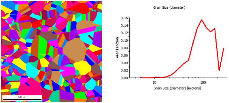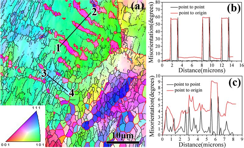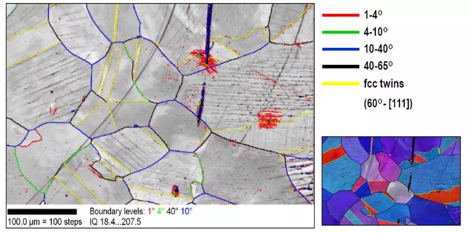 EBSD可应用于取向关系测量的范例有:推断第二相和基体间的取向关系、穿晶裂纹的结晶学分析、单晶体的完整性、微电子内连使用期间的可靠性、断口面的结晶学、高温超导体沿结晶方向的氧扩散、形变研究、薄膜材料晶粒生长方向测量。EBSD测量的是样品中每一点的取向,那么不同点或不同区域的取向差异也就可以获得,从而可以研究晶界或相界等界面。传统的晶粒尺寸测量依赖于显微组织图象中晶界的观察。自从EBSD出现以来,并非所有晶界都能被常规浸蚀方法显现这一事实已变得很清楚,特别是那些被称为“特殊”的晶界,如孪晶和小角晶界。因为其复杂性,严重孪晶显微组织的晶粒尺寸测量就变得十分困难。由于晶粒主要被定义为均匀结晶学取向的单元,EBSD是作为晶粒尺寸测量的理想工具。最简单的方法是进行横穿试样的线扫描,同时观察花样的变化。得到EBSD整个扫描区域相邻两点之间的取向差信息后,可进行研究的界面有晶界、亚晶、相界、孪晶界、特殊界面(重合位置点阵CSL等)。IQ是晶体质量(点阵畸变)、相机测量参数(亮度与对比度)、SEM设置、试样表面条件以及局部晶体取向的函数反极图面分布图 (Inverse pole figure maps)色彩代表了平行于参考方向的晶向(这里参考方向为试样的轧制方向)不同的物相具有不同的晶体结构,其背散射电子衍射花样必然存在一定差别。根据其衍射花样的特征及标定结果,很容易确定其物相。在采用取向成像技术可实现选择物相成像,在图像中能清晰地显示相的分布,并能计算出相的相对含量。就目前来说,相鉴定是指根据固体的晶体结构来对其物理上的区别进行分类。EBSD发展成为进行相鉴定的工具,其应用还不如取向关系测量那样广泛,但是应用于这方面的技术潜力很大,特别是与化学分析相结合。已经用EBSD鉴定了某些矿物和一些复杂相。EBSD最有用的就是区分化学成分相似的相,如,在扫描电子显微镜中很难在能谱成分分析的基础上区别某元素的氧化物或碳化物或氮化物,但是,这些相的晶体学关系经常能毫无疑问地区分开。M7C3和M3C相(M大多是铬)已被从二者共存的合金中鉴别出来,因为它们分别属于六方晶系和四方晶系,这样它们的电子背散射衍射花样(EBSP)就完全不同。类似地,已用EBSD区分了赤铁矿、磁铁矿和方铁矿。最后一个例子,也许是用EBSD进行相鉴定的最简单的应用之一,就是直接区别铁的体心立方和面心立方,这在实践中也经常用到,而且用元素的化学分析方法是无法办到的,如钢中的铁素体和奥氏体。而且在相鉴定和取向成像图绘制的基础上,很容易地进行多相材料中相百分含量的计算。晶体的缺陷密度是影响背散射电子衍射花样中菊池线清晰程度的主要因素,菊池线的清晰程度随缺陷密度的增大而下降。若采集的菊池线模糊不清,说明分析点处的晶体存在较大的应变。因此,根据衍射花样的质量可定性评价应变的大小。通常用菊池线质量形成形貌图来判断,图中亮的区域说明菊池线质量高,对应的应变较小,而应变越大的区域图像越暗。Fe-20Mn-3Al-3Si高锰钢850℃退火1h后不同应变下的EBSD微区取向成像 a, c, e, g) KiKuchi花样质量图; b, d, f, h) 反极图的面分布图; a, b) 0.03; c, d) 0.11; e, f) 0.25; g, h) 0.45断裂存在于材料中的应变影响其抗拉强度或韧性等性能,进而影响零件的使用性能。衍射花样中菊池线的模糊证明晶格内存在塑性应变。因此从花样质量可直观地定性评估晶格内存在的塑性应变。用EBSD进行应变测量的一些例子如下:对材料晶体结构及晶粒取向的传统研究方法主要有两个方面:(1)利用X光衍射或中子衍射测定宏观材料中的晶体结构及宏观取向的统计分析;(2)利用透射电镜中的电子衍射及高分辨成象技术对微区晶体结构及取向进行研究。前者虽然可以获得材料晶体结构及取向的宏观统计信息,但不能将晶体结构及取向信息与微观组织形貌相对应,也无从知道多相材料和多晶材料中不同相及不同晶粒取向在宏观材料中的分布状况。EBSD恰恰是进行微织构分析、微取向和晶粒取向分布测量,可以将晶体结构及取向信息与微观组织形貌相对应。而透射电镜的研究方法由于受到样品制备及方法本身时的限制往往只能获得材料非常局部的晶体结构及晶体取向信息,无法与材料制备加工工艺及性能相直接联系。X射线衍射或中子衍射不能进行点衍射分析。除了EBSD外,还有其他的点分析技术,主要有SEM中的电子通道花样(SAC)和透射电子显微镜(TEM)中的微衍射(MD),一般认为EBSD已经取代SAC,而TEM中的微衍射(MD)需要严格的样品制备,且不可能进行自动快速测量。定位的相鉴定早已成为TEM的工作,但其样品制备经常是不方便的,甚至是不可能的,因此EBSD成为极有吸引力的选择。因此,EBSD是X射线衍射和透射电子显微镜进行取向和相分析的补充,而且它还有其独特的地方(微区、快速等)。(1) 对晶体结构分析的精度已使EBSD技术成为一种继X光衍射和电子衍射后的一种微区物相鉴定新方法;(2)晶体取向分析功能使EBSD技术已逐渐成为一种标准的微区织构分析技术新方法;(3)EBSD方法所具有的高速(每秒钟可测定100个点)分析的特点及在样品上自动线、面分布采集数据点的特点已使该技术在晶体结构及取向分析上既具有透射电镜方法的微区分析的特点又具有X光衍射(或中子衍射)对大面积样品区域进行统计分析的特点。因此,装有EBSD