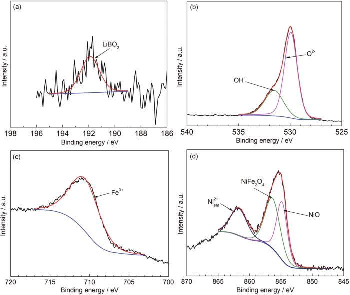 图6所示为污垢沉积实验后试样表面的XPS表征结果,分别对B、O、Fe和Ni在燃料包壳污垢中的价态及其可能存在形态进行了分析。结果表明,在当前污垢沉积状态下,污垢内部的含硼物相主要为LiBO2,含铁物相可能为Fe2O3、NiFe2O4,含镍物相可能为NiO、NiFe2O4。