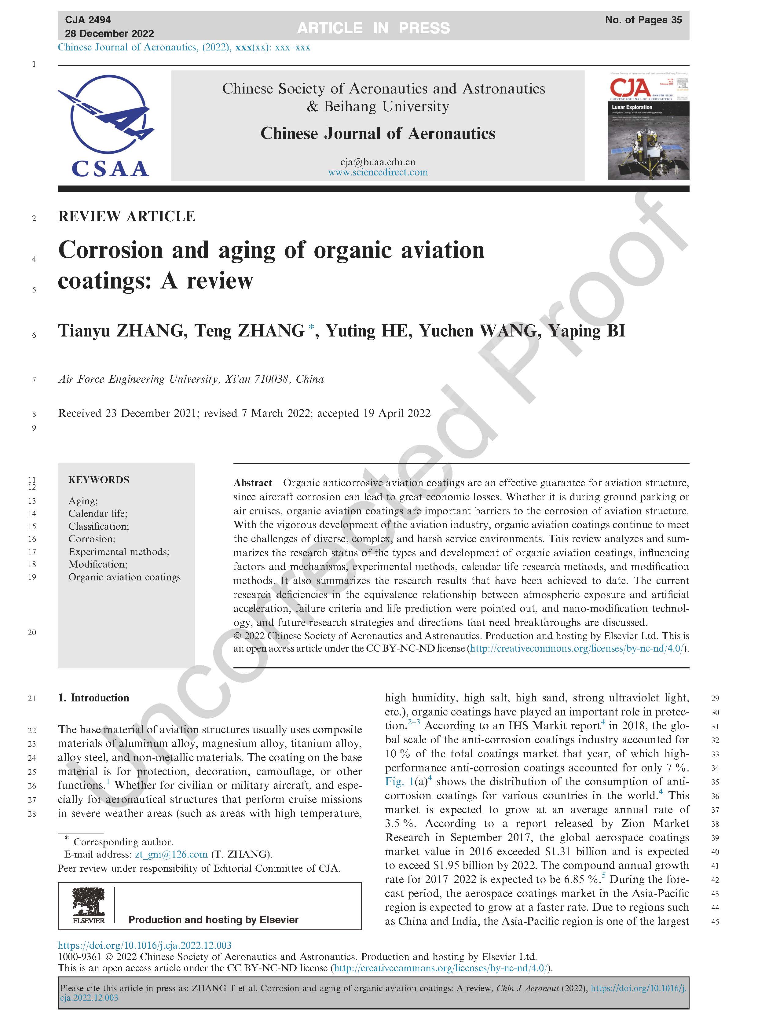 航空有机涂层对航空结构和航空安全起到了重要的保护作用。由于其独特而严酷的服役环境,涉及的腐蚀老化问题、日历寿命问题等十分复杂,这也是众多学者的研究重点。本文通过较长篇幅的论述,对目前针对航空有机涂层腐蚀老化相关问题的研究进行了较为详尽的介绍。