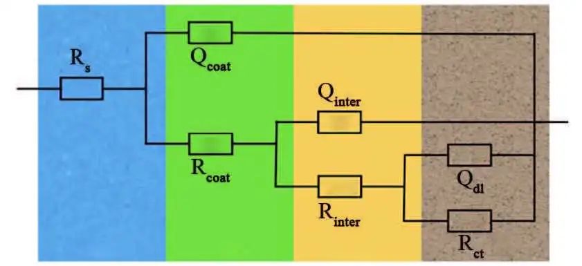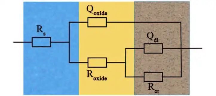 Rsol:溶液电阻;Rcoat:涂层电阻;Qcoat:涂层电容;Rint:中间层电阻;Qint:中间层电容;Rct:电荷转移电阻;Qct:双电层电容;Roxide:基体氧化层电阻;Qoxide:基体氧化层电容
