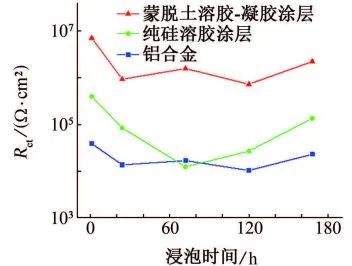 表1 铝合金基体、纯硅溶胶涂层和蒙脱土溶胶-凝胶涂层的电化学阻抗谱拟合结果
