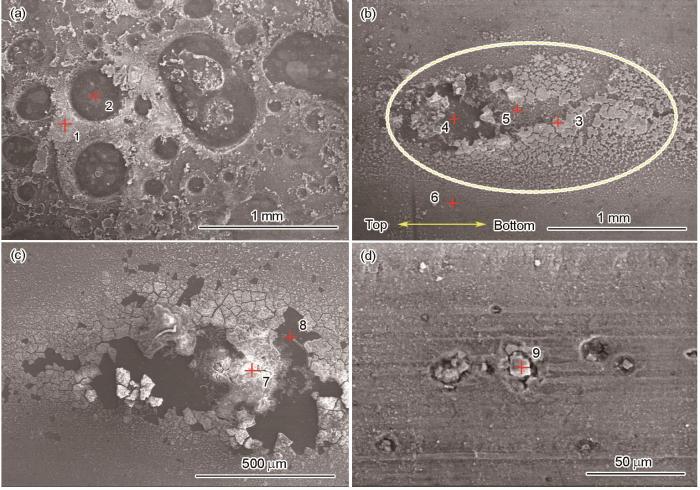 Fig.11   Microcosmic corrosion morphologies of 2024 aluminum alloy in atmosphere region (a), seawater/air interfacial region (b), and full immersion region (c, d) for 54 d