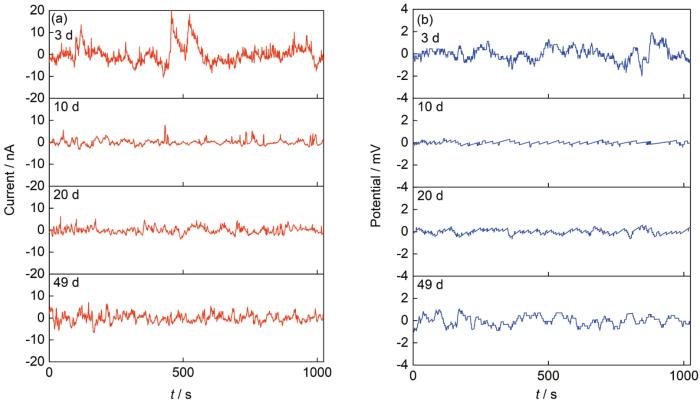 图7   2024 铝合金在全浸区的电流噪声和电位噪声时域谱