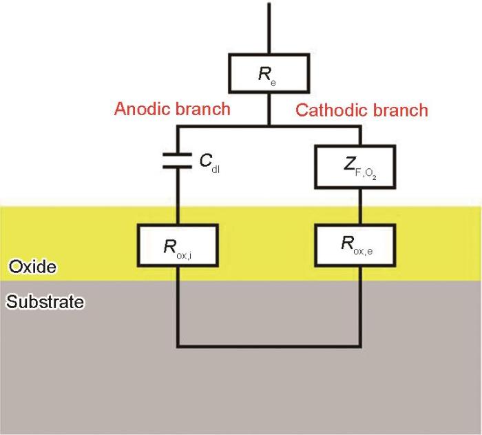 Fig.4   Electrochemical equivalent circuit of 2024 aluminum alloy in seawater/air interfacial region and full immersion region (—the electrolyte resistance; —the capacitance of the double electric layer; —the Faradaic resistance of oxygen reduction at oxide/electrolyte interface; —the resistance of cation vacancies moving in the oxide; —the resistance of electrons moving in the oxide)