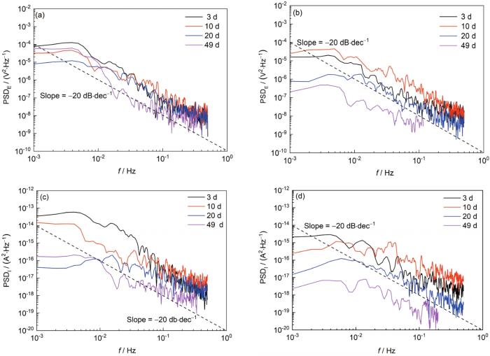 (3) EN测试结果表明,电流噪声的波动幅值及其PSD低频白噪声水平先减小后增大,表明局部腐蚀敏感性先减小后增大,电位噪声的PSD高频线性区斜率均小于-20 dB/dec,表明其腐蚀类型均为局部腐蚀。
