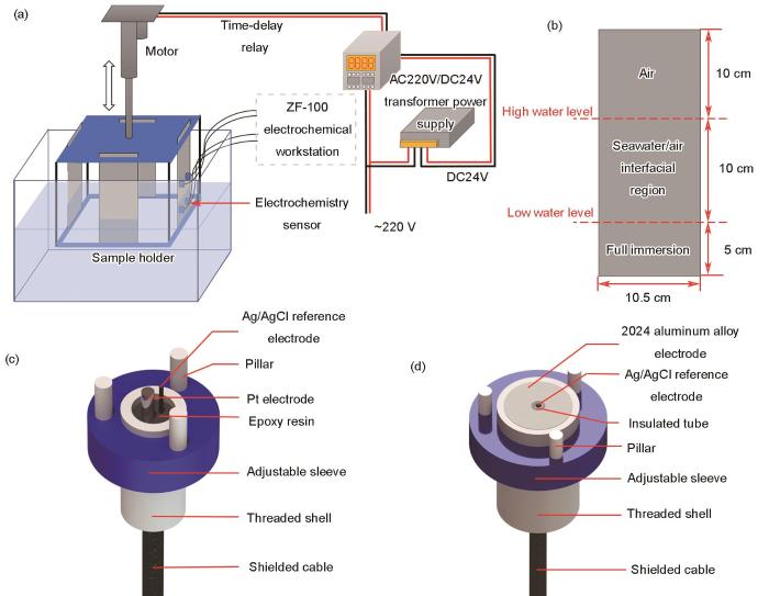 本工作搭建由电动推杆、时间继电器及腐蚀电化学传感器组成的模拟动态水气界面腐蚀测试平台,采用腐蚀电位监测、电化学阻抗谱(EIS)和电化学噪声(EN)技术研究2024铝合金在水气界面区的腐蚀电化学行为及局部腐蚀机制,并分析水气界面区与全浸区腐蚀行为的差异性,探讨不同区域腐蚀电位不同对宏观腐蚀电池的影响机制,为深入理解海水/大气界面的局部腐蚀损伤机制奠定理论基础。