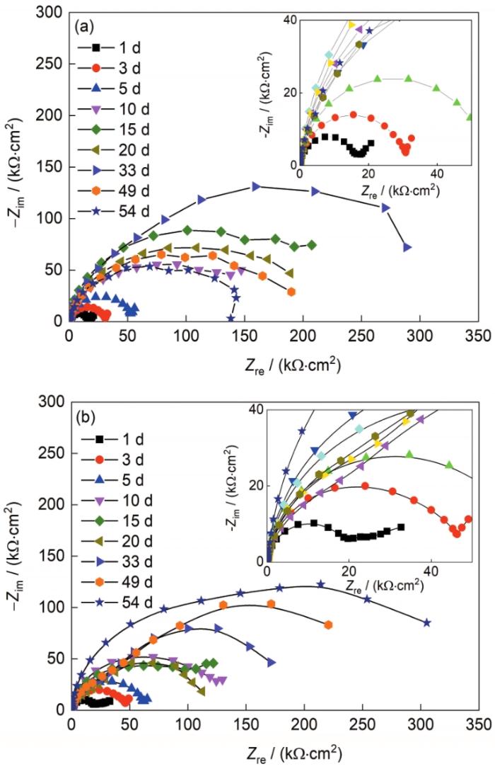 采用EIS技术对2024铝合金在水气界面和全浸区54 d的腐蚀过程进行了检测,结果分别如图3a和b所示。从图3a可以看出,水气界面区的容抗弧半径出现先增大后减小的趋势,33 d对应的容抗弧半径最大。1 d对应的容抗弧半径约15 kΩ·cm2,由于容抗弧半径近似等于腐蚀体系的极化电阻,说明此时钝化膜虽然有一定的耐蚀性,但易发生破裂,局部腐蚀萌生。随着腐蚀进行,铝合金表面生成一层较为均匀致密的腐蚀产物层,容抗弧半径不断增大,33 d达到最大值。此后由于腐蚀的不断进行,靠近铝合金基体的腐蚀产物的生成会导致外层的腐蚀产物膜部分脱落,容抗弧半径有所减小,与10 d的容抗弧半径相当。前5 d的EIS呈现“单”容抗弧特征,之后由于腐蚀产物膜的覆盖,呈现“双”容抗弧特征,表明腐蚀体系最开始的电极反应速率由钝化膜的完整性控制,逐渐变为由腐蚀产物膜层控制。