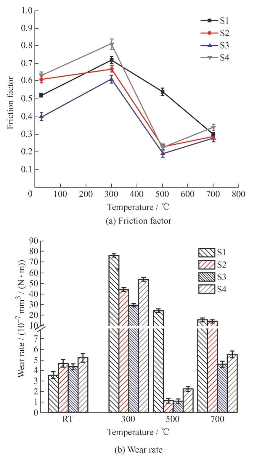 PS/PM系列涂层的分类依据为各种相的占比不同,其中PS100缺乏硬质相,涂层耐磨性较差,但在宽温域范围内能够保持稳定的摩擦因数; PS/PM200涂层中随着硬质相加入,耐磨性大幅度提高,但其摩擦因数稍微提高,一定程度上限制了该涂层的低摩擦应用;PS/PM300涂层以Cr2O3 为固体润滑相,克服了Cr2C3 的高温氧化和加工困难等问题,其摩擦因数比前一系列普遍降低。林韶宁等[45]通过热处理PS304 发现涂层中出现铬含量升高、析出并发生固态扩散和微观结构变化,涂层强度明显增加,改善了PS300涂层因氧化和磨损导致的剥落失效[46];PS400涂层通过改变相组成的含量改善高温氧化,但室温环境下依然摩擦因数较高[42]。研究结果表明尽管PS/PM系列涂层仍存在缺点,但是通过改变相的组成、比例、结构参数等可以大幅度改善其摩擦学性能。