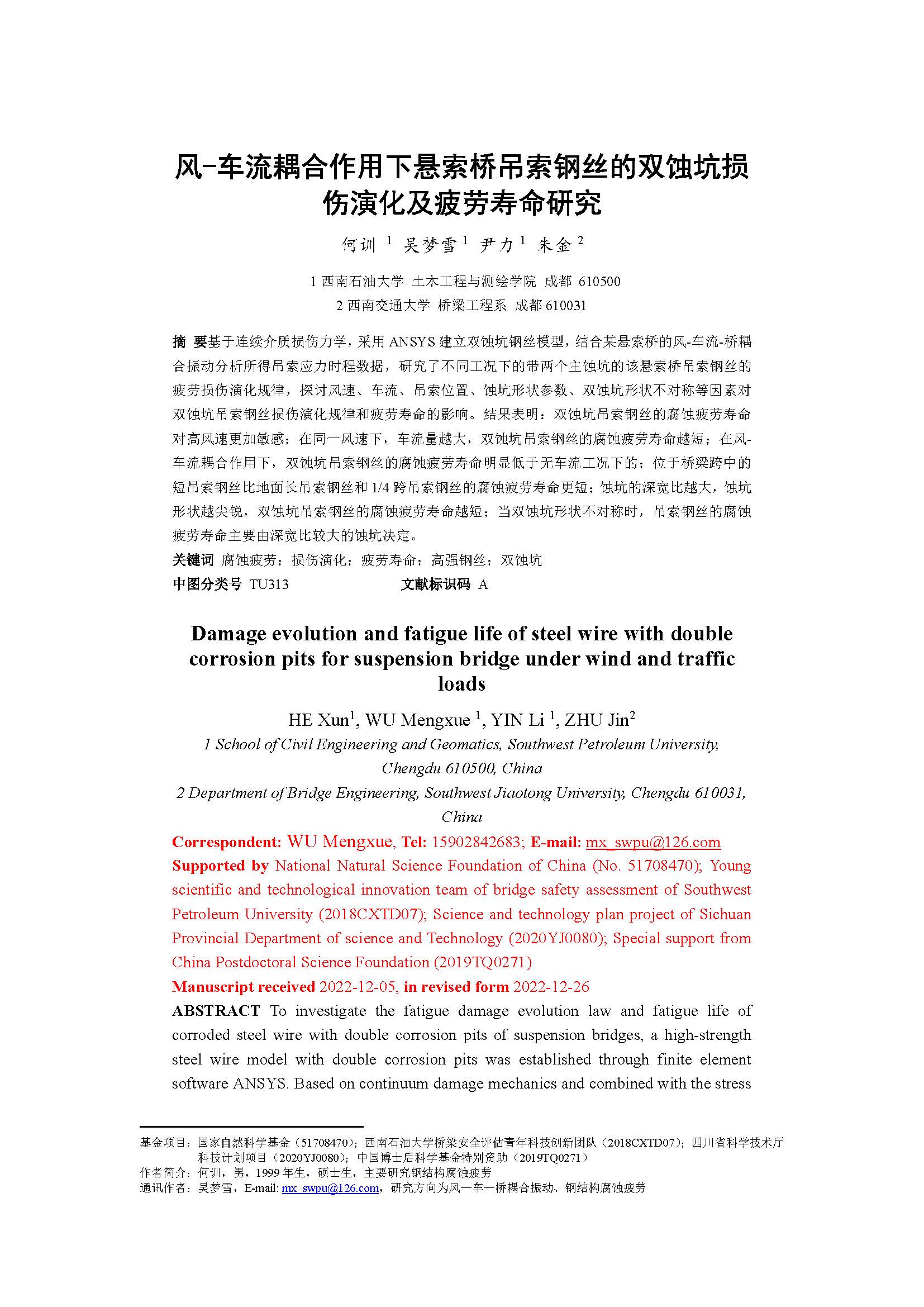 风-车流耦合作用下悬索桥吊索钢丝的双蚀坑损伤演化及疲劳寿命研究