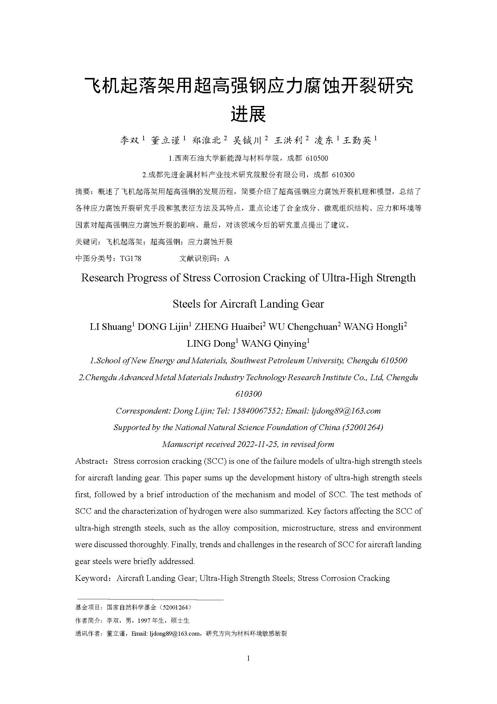 飞机起落架用超高强钢应力腐蚀开裂研究进展