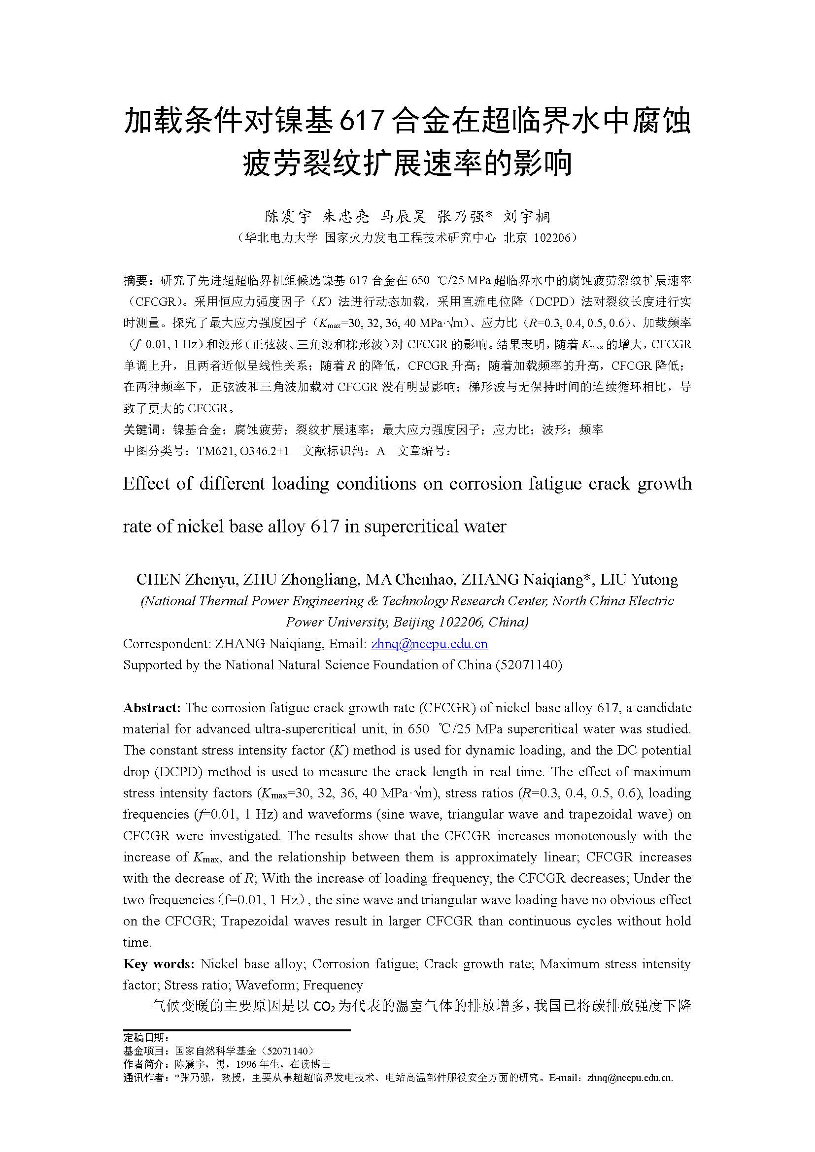 加载条件对镍基 617 合金在超临界水中腐蚀疲劳裂纹扩展速率的影响