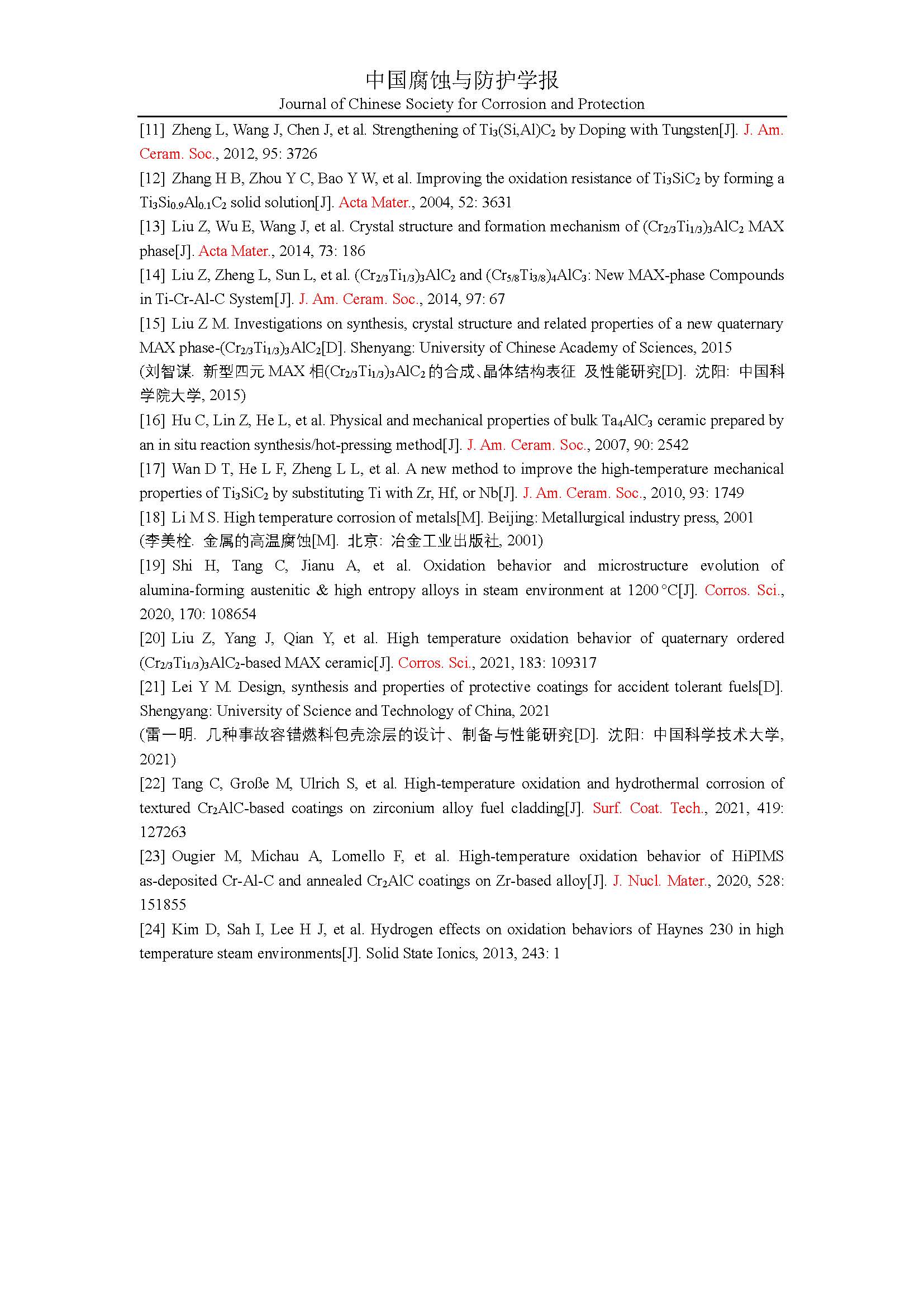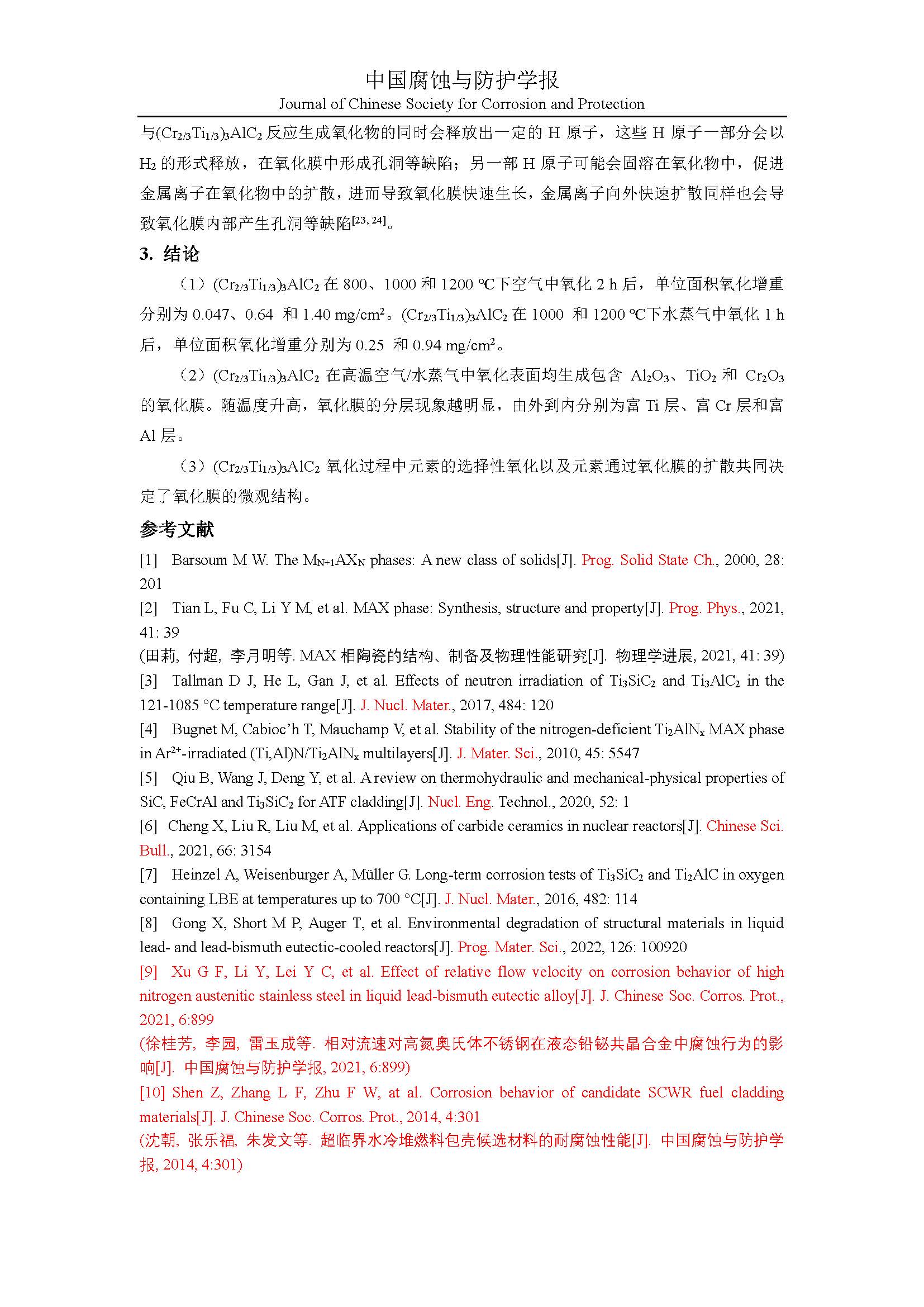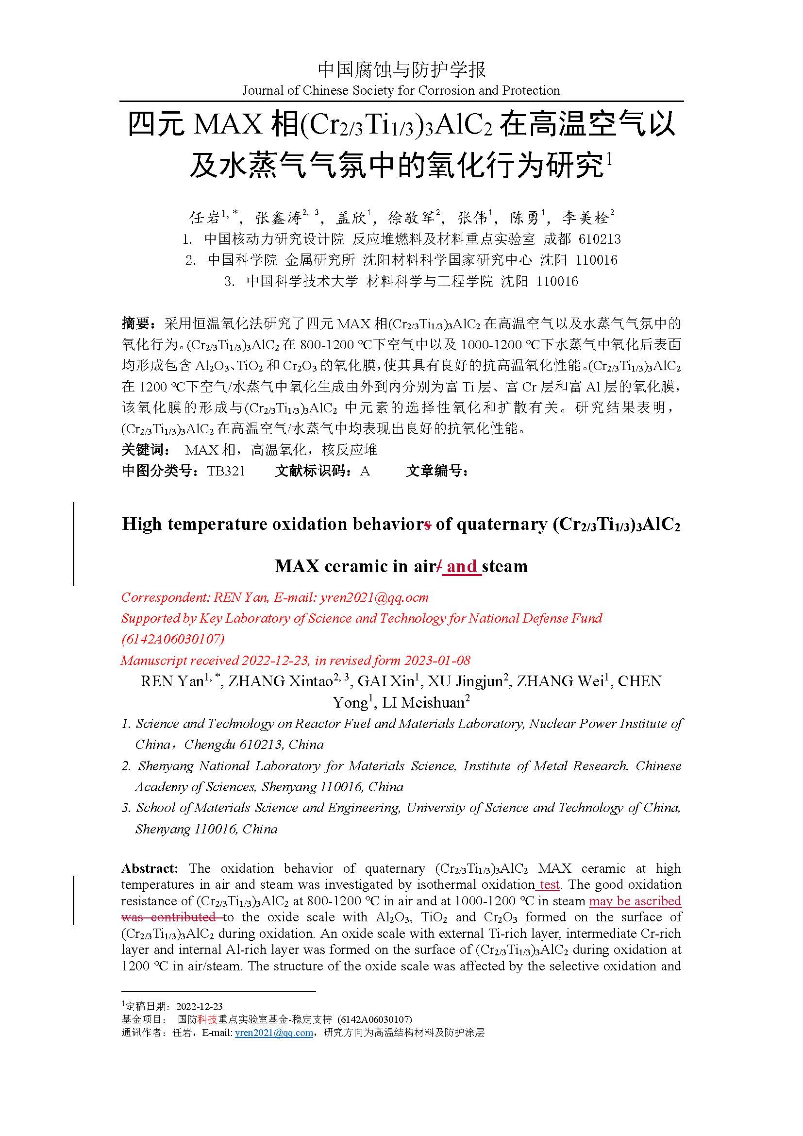 四元 MAX 相(Cr2/3Ti1/3)3AlC2在高温空气以及水蒸气气氛中的氧化行为研究