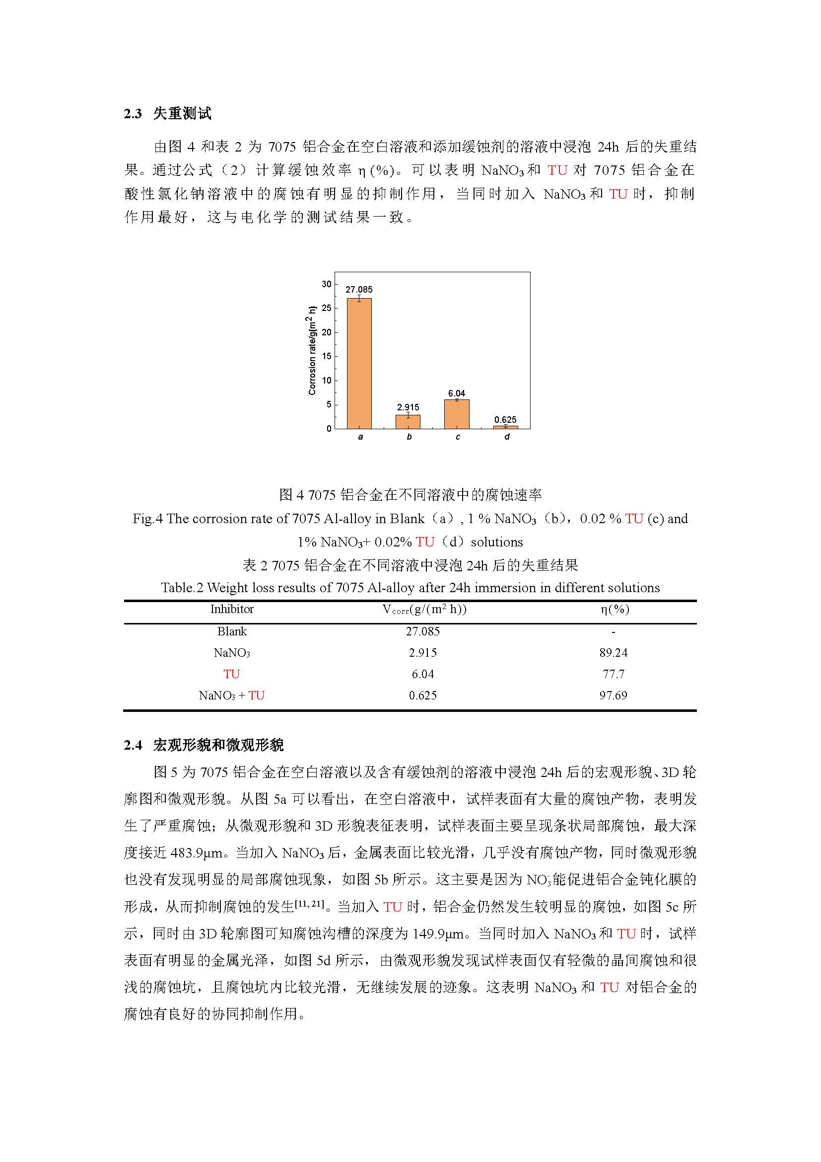 酸性氯化钠溶液中硝酸钠和硫脲对 7075 铝合金缝隙腐蚀的协同缓蚀作用