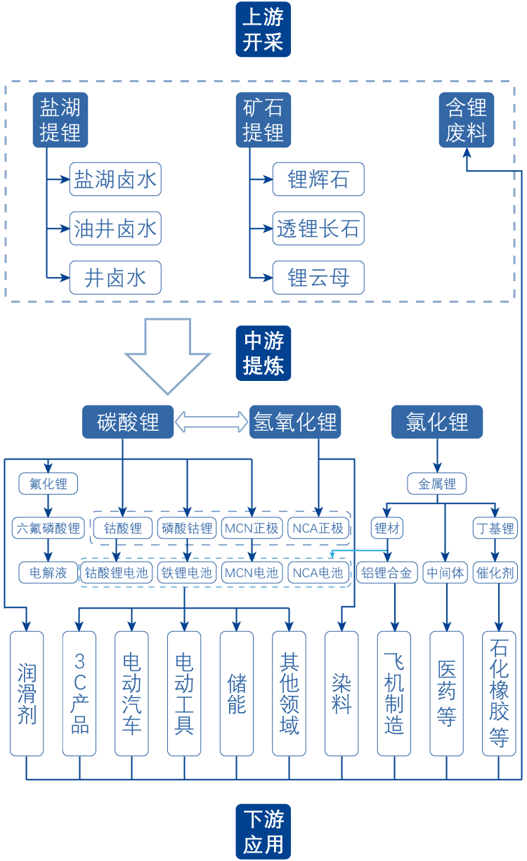 锂产业链主要分为上游开采、中游提炼及下游应用。从产业结构上看,锂资源供给主要来自盐湖提锂及矿石提锂,锂电池回收当前规模体量仍低,尚待新能源车动力电池报废期来临。