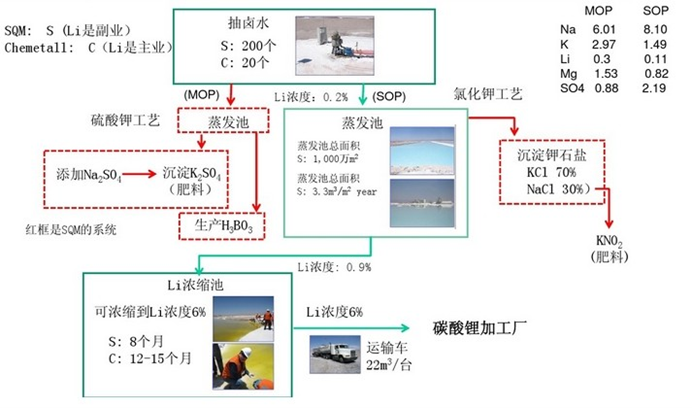 盐湖资源中主要成分是氯、钠、钾、硫、硼、镁、锂等,微量锂与大量碱金属、碱土金属共存,这些元素均是以液态形式存在,且大部分与锂具有相似相溶的性质,易与锂伴生出现。所以盐湖卤水开发通常是对各有用成分进行分别制取,而不是单纯提锂。