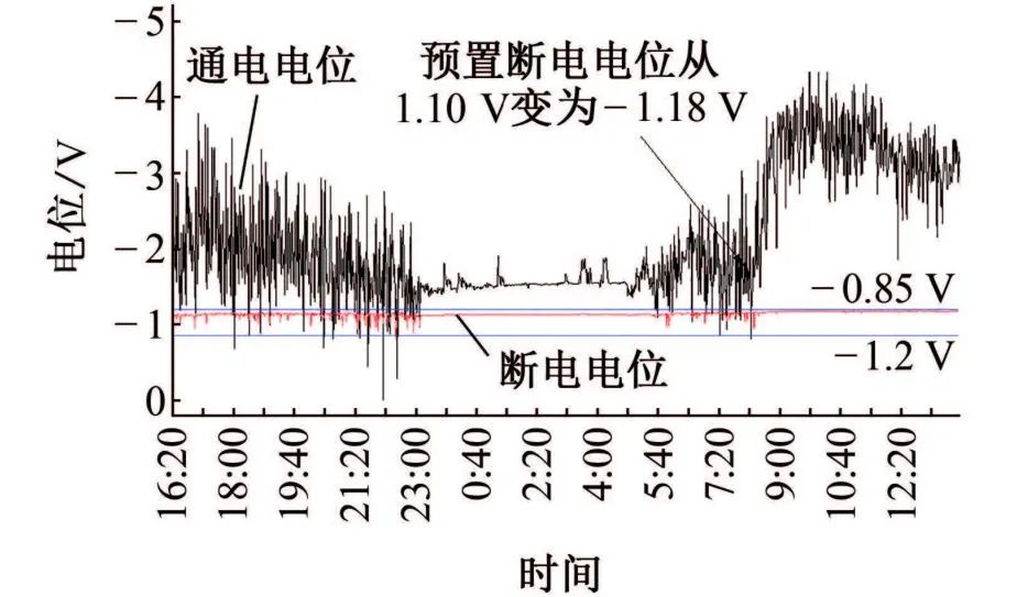 在测试周期内,新型恒电位仪的输出电流与输出电压变化详见图3,可见当预置断电电位为-1.10 V时,输出电流运行平稳,波动较小。由于管道与阳极地床之间土壤中存在杂散电流引起的IR降,输出电压受杂散电流干扰存在波动。当预置断电电位为-1.18 V时,输出电流及输出电压随之升高。相比传统恒电位仪的恒通电电位控制,新型恒电位仪在恒断电电位模式下,输出波动小,运行稳定,输出电流能根据预置断电电位进行调整。