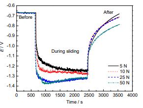 图5 2024铝合金在人工海水中不同载荷下摩擦前后以及摩擦过程中的开路电位变化