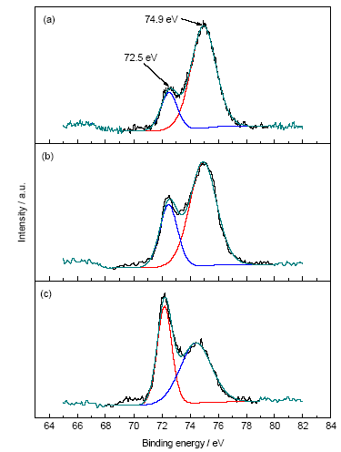 为了研究磨损表面腐蚀磨损产物膜的主要成分,对磨损表面做不同深度的XPS分析,如图4所示。可以看出,Al2p谱均为双峰,分别在结合能为74.9和72.5 eV附近,对比标准数据库和手册可知,磨损表面形成一层以γ-Al2O3 (74.9 eV) 为主的氧化层,且随着刻蚀时间的增长,即不同深度亚表层的γ-Al2O3减少,金属Al (72.5eV) 的含量上升。验证了铝合金在海水中形成一层以非晶γ-Al2O3为主的含水氧化物表面膜,形成的钝化膜孔率大、不致密、保护能力差,且含水的Al2O3H2O在室温下质脆、易剥落,高载下的磨损很容易导致脆性Al2O3薄膜受损形成机械裂缝,在往复载荷的作用下剥落,加速铝合金磨损。而经抛光处理的铝合金表面较为活泼,在大气中也会形成一层氧化层,具有一定的耐蚀性,但厚度较薄,在实验开始摩擦2~5 min内就已经磨损 (如图5所示),表现为开路电位急剧下降。腐蚀磨损过程中形成的孔隙率大、不致密的产物膜,不同于实验前经抛光处理的铝合金表面形成的均匀、较薄的氧化膜,也不同于未经处理的铝合金表面的致密、较厚的氧化层。