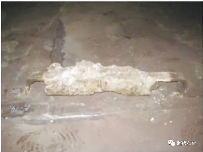 加强圈上表面为安装保温层而设置的扁钢(见图9)的安装方式不合理(采用点焊),易形成进水通道。外界降水通过加强圈外缘进入扁钢内部,与保温层接触,不易散失,并易在加强圈与罐壁焊接位置富集,为该处罐壁腐蚀提供了环境条件,导致腐蚀发生。