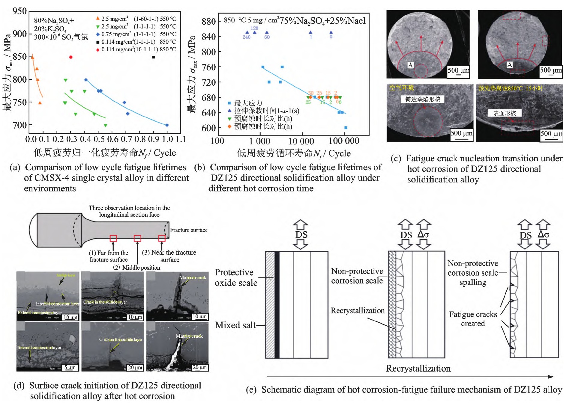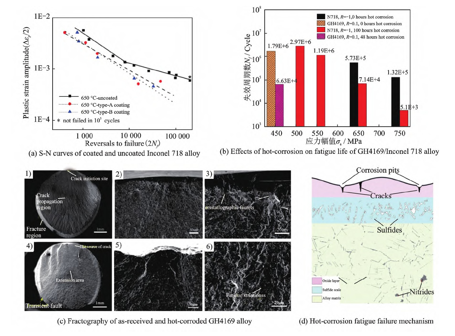 Gabb等[70,71]对表面喷丸强化的ME3合金进行了热腐蚀后的疲劳性能研究。研究结果表明,对于未喷丸强化的ME3合金,热腐蚀使低周疲劳寿命降低了60%~98%,疲劳裂纹萌生与腐蚀坑的大小和间距密切相关。此外,温度对于热腐蚀下的疲劳裂纹萌生也有影响。高温(704℃)时裂纹沿腐蚀坑周围晶界萌生,低温(204℃)时裂纹由腐蚀坑底部晶界萌生。喷丸处理减轻了204℃轻度热腐蚀对疲劳寿命的影响,但在重度热腐蚀ME3合金中,喷丸强化抑制疲劳破坏的效果不明显。分析认为喷丸处理可在试样表面形成残余压应力,能够减轻腐蚀坑对疲劳寿命的影响。但由于腐蚀坑处的疲劳开裂,较长的腐蚀时间和高温下的疲劳仍会导致喷丸试样的疲劳寿命大幅降低。此外,Smialek等[72]研究了热腐蚀对带有Cr2AlC涂层的LSHR合金疲劳寿命的影响,研究结果表明,对合金进行热腐蚀后,无涂层合金相较于未热腐蚀时的寿命降低约93%,而有涂层合金寿命降低仅为约15%,表明Cr2AlC涂层有益于抵抗热腐蚀-疲劳破坏。
