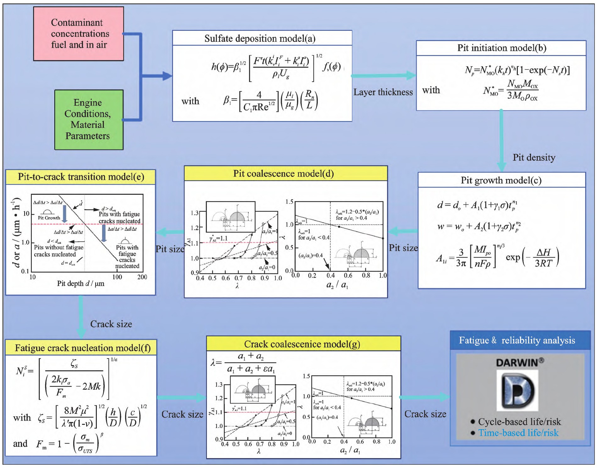 图9 RR1000合金热腐蚀-疲劳性能[68-69]Fig.9 Hot corrosion-fatigue failure mechanisms of RR1000 alloy[68-69]目前,关于热腐蚀对涡轮盘合金疲劳性能的影响规律与机理有了较为清楚的认识,但与涡轮叶片高温合金类似,现有的研究结果主要是基于对涡轮盘合金进行预先热腐蚀然后开展疲劳试验而获得的,不能实时反映热腐蚀与机械载荷的交互作用,因此,开展热腐蚀-疲劳载荷耦合作用下涡轮盘合金的疲劳失效机理和规律仍值得进一步研究。此外,对于涡轮盘而言,为了提高涡轮盘损伤容限设计水平,以满足高推重比航空发动机在海洋服役环境下耐久性、可靠性、安全性设计要求,需对涡轮盘用高温合金在海洋环境-工况耦合下的疲劳裂纹扩展测试方法及微观机理展开深入研究,为航空发动机涡轮盘材料的疲劳裂纹扩展寿命预测方法及损伤容限设计提供数据和技术支撑。高温热腐蚀环境下的疲劳过程同时受到载荷、温度和腐蚀介质3方面的影响,其作用更加复杂,损伤过程分为热腐蚀坑的萌生和生长、热腐蚀坑向疲劳裂纹转变、疲劳裂纹萌生、小裂纹扩展、长裂纹扩展和断裂[73,74]。在这些损伤过程中,热腐蚀坑的萌生和生长以及裂纹萌生和小裂纹扩展占据了疲劳寿命的绝大部分(70%~80%)。在热腐蚀-疲劳模型研究方面,高温热腐蚀-疲劳寿命预测模型需要考虑温度、载荷水平、介质浓度等许多方面的因素。目前常用的疲劳寿命预测模型主要包括唯象模型、损伤力学模型和断裂力学模型[75,76]。唯象模型主要是基于对热腐蚀损伤特征的表征,对应力或应变-寿命方程进行一定程度的修正;损伤力学模型主要是通过对热腐蚀损伤的表征,建立耦合热腐蚀损伤和机械载荷损伤的损伤变量,建立损伤变量演化和疲劳寿命之间的关系;断裂力学模型是将热腐蚀损伤视为初始裂纹,采用断裂力学理论对剩余寿命进行预测和评定。然而,热腐蚀-疲劳寿命预测的唯象模型、损伤力学模型和断裂力学模型各有优缺点。唯象模型简单且能较准确预测热腐蚀-疲劳寿命,但其不能体现热腐蚀-疲劳机理且其预测精度依赖于大量的实验数据;损伤力学模型同样可以获得较为精准的预测结果,但其往往局限于一些简单的结构;断裂力学模型可用于复杂结构,但其未考虑裂纹萌生阶段的疲劳寿命,因此预测结果往往偏于保守。近期,赵高乐等[75]在综述中对热腐蚀-疲劳寿命模型做了系统的总结和归纳,因此,下文着重针对近10年关于涡轮叶片和涡轮盘合金热腐蚀-疲劳寿命预测方法进行总结。鉴于目前文献中关于涡轮盘、涡轮叶片高温合金热腐蚀-疲劳寿命预测和分析均未考虑高温合金的微结构特征,并且用于描述高温合金变形的本构方程皆为宏观唯象本构。因此,本节对热腐蚀-疲劳寿命预测方法的总结和介绍不再区分涡轮盘合金和涡轮叶片合金。近年来,在NASA的资助下,美国Elder研究院(ERI)和西南研究院(SwRI)Chan等[77]开发了一套基于物理的建模工具HOTPITS,用于预测镍基高温合金的热腐蚀[78]和低温热腐蚀寿命预测,并将其与概率损伤容限分析软件DARWIN结合使用,用于预测发动机轮盘中因腐蚀坑引起的疲劳失效,其示意图如图10所示,主要步骤包括:(1)硫酸盐沉积模型,用于根据燃料和空气中污染物浓度的输入以及相关发动机条件预测热端部件上硫酸盐层的形成;(2)用于预测热腐蚀坑密度的热腐蚀坑萌生模型;(3)用于预测热腐蚀坑大小随时间变化的热腐蚀坑生长模型。同时针对热腐蚀往往伴随有多个热腐蚀坑形成的情况,还进一步发展了考虑热腐蚀坑合并的模型,以处理多个腐蚀坑的生长与合并。为了在热腐蚀-疲劳寿命预测中考虑腐蚀坑的影响,建立了腐蚀坑到裂纹的转化模型、疲劳裂纹形核模型、生长模型以及裂纹合并模型。通过将HOTPITS与DARWIN[79]软件结合使用,Chan等以粉末高温合金ME3为研究对象,发现了热腐蚀坑生长和疲劳裂纹生长之间存在竞争,且低温热腐蚀疲劳寿命由热腐蚀坑生长、循环相关的裂纹扩展以及时间相关的裂纹扩展共同控制,提出了一种预测粉末高温合金涡轮盘腐蚀疲劳裂纹扩展寿命的概率预测方法,可用于评估涡轮盘中热腐蚀引起的故障风险,避免发动机轮盘及其他金属结构部件因长期暴露于高温极端环境而发生腐蚀疲劳故障。Li等[80]提出了一种将FGH96合金中的腐蚀坑视为微缺口的腐蚀疲劳寿命预测方法,该方法考虑了热腐蚀和非均匀应力场的影响。首先,对由粉末高温合金FGH96制成的未涂盐试样和涂盐试样进行LCF测试,使用法拉第定律估计热腐蚀坑形成时间。法拉第定律的表达式为