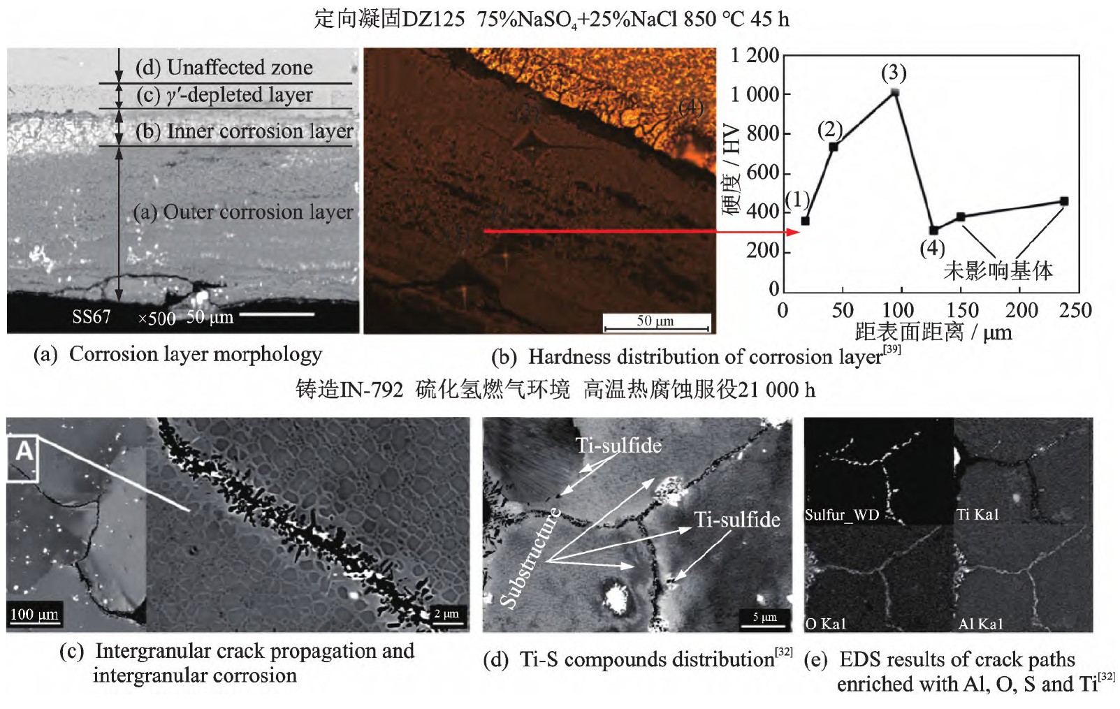 随着中国深海和远海战略的实施,大批先进舰艇下水,国产航母和大量舰载机也投入服役。相比陆地航机,舰载机航空发动机和燃气轮机热端部件在服役过程中的环境条件异常苛刻,除发动机/燃气轮机热端零部件所承受的高温、高压、高转速等载荷环境外,还承受海洋高盐雾、高湿度等腐蚀环境的影响。涡轮转子部件是舰载机航空发动机/燃气轮机中服役环境最恶劣的部件,不仅要在高温(600~1 300℃)条件下承受巨大的交变载荷,高温燃气和海洋大气中的热腐蚀也会加剧其损伤程度,涡轮转子部件因此成为故障率最高的工作部件之一。如图1所示,涡轮叶片因在燃气-海洋大气耦合环境中,在高温、高转速载荷下发生的热腐蚀-疲劳失效[1,2,3,4,5,6]。相比于单一机械载荷作用下的疲劳失效,航空发动机和燃气轮机热端部件热腐蚀-疲劳失效机理更为复杂,对热腐蚀-疲劳寿命预测难度更大。目前,国内外对航空发动机和燃气轮机热端部件热腐蚀-疲劳失效机理有了初步的认识,针对热端部件材料开展了热腐蚀机理研究、热腐蚀-疲劳失效机理研究以及热腐蚀-疲劳寿命预测,并取得了初步的成果。本文针对过去20年在航空发动机和燃机轮机热端部件热腐蚀-疲劳的研究进展进行梳理和总结归纳,以期促进燃气-海洋环境耦合作用下航空发动机和燃气轮机热端部件结构完整性评定方法的发展,提高航空发动机和燃气轮机的安全性和可靠性。Fig.1 Hot corrosion-fatigue failure of turbine blades镍基高温合金以其高温下优异的疲劳性能、蠕变性能和持久性能[7,8,9],成为航空发动机与燃气轮机涡轮叶片、涡轮盘等热端部件的主要材料[10,11,12]。同时,为了降低涡轮叶片表面温度和提高其抗氧化/腐蚀性能,在涡轮叶片表面通常喷涂有金属涂层或热障涂层(Thermal barrier coating,TBC)[13,14]。发动机在服役过程中,燃料中的杂质S在燃烧时会产生SO2、SO3等硫化物,与海洋大气环境中NaCl反应后会在合金表面沉积一层Na2SO4熔盐膜,形成的硫酸盐等沉积物导致涂层、高温合金发生热腐蚀,最终导致发动机热端部件过早失效[15,16]。高温合金热腐蚀是指沉积于合金表面的硫酸盐等沉积物破坏表面氧化物而加速合金腐蚀的行为[17]。对于高温合金来说,热腐蚀造成的破坏要比单纯高温氧化严重得多,其严重性受多因素影响,包括温度、沉积盐的种类和含量、环境条件、气体成分和合金成分等。根据环境温度高低,热腐蚀可分为低温热腐蚀和高温热腐蚀[18]。低温热腐蚀(560~815℃)一般在腐蚀盐的熔点之下发生,限制条件是需要较高分压的气相SO3,与涂层或者基体中的合金元素反应形成新的硫酸盐,这些硫酸盐与Na2SO4形成低熔点(熔点为540℃)的共晶化合物,使合金发生局部点蚀。高温热腐蚀(815~980℃)通常在腐蚀盐熔点以上温度发生,熔融态碱金属盐在基体表面沉积,然后逐渐破坏氧化层并消耗基体金属中的Cr,随着Cr元素耗尽,氧化速度加快,涂层或基体内部开始形成细微的孔洞,为腐蚀介质浸入提供通道。此时熔融状态的沉积盐使合金发生均匀腐蚀,高温热腐蚀的氧化层与合金基体交界处相对平整,界面下方有明显的硫化物形成。关于金属材料,尤其是铁基和镍基高温合金热腐蚀机理,Rapp[19]和Singh等[20]在21世纪初对其进行了总结。因此,本文主要针对近20年涡轮盘、涡轮叶片高温合金及涂层的热腐蚀机理进行综述。根据航空发动机和燃气轮机具体的服役工况和涡轮前温度,常用的涂层有渗铝涂层[21](如在叶片表面和内腔渗铝、渗铝硅涂层)、MCrAlY涂层[22]和热障涂层[23]等。高温合金叶片的典型热障涂层通常由金属黏结层和隔热陶瓷层组成,在高温合金叶片基体与高温燃气间提供隔热层和抗氧化层,从而保障叶片在较高的涡轮前温度下安全工作。金属黏结层可以提高基体合金与表面陶瓷层的结合强度,在高温服役过程中还可以形成一层致密的热生长氧化物(Thermally grown oxide,TGO)层,起到抗高温氧化的作用。目前常用的TBCs材料有:Y2O3稳定的ZrO2(YSZ、Y2O3的质量分数一般为7%~8%)、莫来石、Al2O3、YSZ+CeO2、La2Zr2O7、硅酸盐,其中YSZ是应用最广泛的TBCs材料[21,24,25]。由于涡轮叶片表面涂层在服役过程中承受温度高(>800℃),在燃气和海洋环境耦合工况下,涂层通常发生高温热腐蚀。取决于涂层类型、成分和微观结构,其热腐蚀产物也有所区别。对于金属涂层,其抗热腐蚀性能与涂层表面形成连续致密的Al2O3保护性氧化层密切相关。李玉春[26]采用埋盐法对K488合金及其表面渗铝和渗钴铝涂层的K488合金的热腐蚀行为进行研究,发现在900℃的25%NaC1+75%Na2SO4熔融盐中渗铝涂层表面生成了Al2O3和CoCr2O4的混合物,由于混合氧化物的存在使得耐腐蚀性提高,而渗钴铝涂层由于表面生成致密的Al2O3保护性氧化膜,表现出优异的抗热腐蚀性能。李艳明等[27]针对燃机叶片常用材料DSM11镍基高温合金,在其表面制备了Al-Si、Al和Co-Al这3种涂层,并通过在涂层表面涂盐(质量分数为5%NaC1+95%Na2SO4),研究了3种涂层在900℃的热腐蚀性能,如图2所示。研究结果表明,3种涂层的动力学曲线基本相似,均呈抛物线形,随腐蚀时间的延长,质量先增加后减少。产生上述质量变化的原因在于:在腐蚀实验前期(0~25 h),腐蚀产物与涂层结合紧密,腐蚀产物脱落较少;而在腐蚀的中、后期,表面腐蚀产物脱落,重新裸露出的内部涂层或基体进一步发生热腐蚀,质量减少。在900℃热腐蚀200 h后,Al-Si涂层和Co-Al涂
