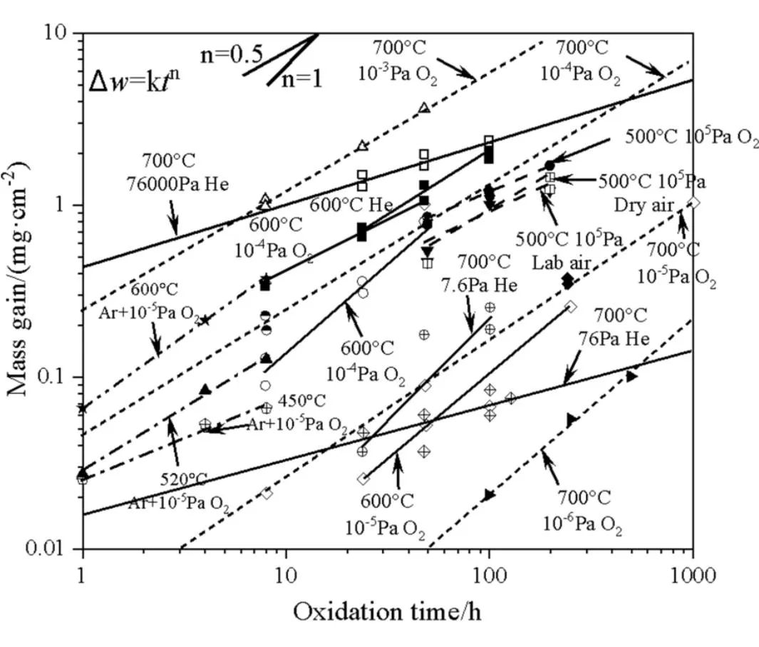 图1是V-4Cr-4Ti合金在不同温度和氧分压环境中的单位面积氧化增重规律。可知即使在高真空或高纯He中(氧分压≤10-4 Pa),V-4Cr-4Ti合金在500~700 ℃区间仍然会发生明显的吸氧增重现象。