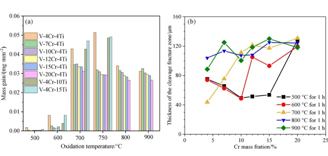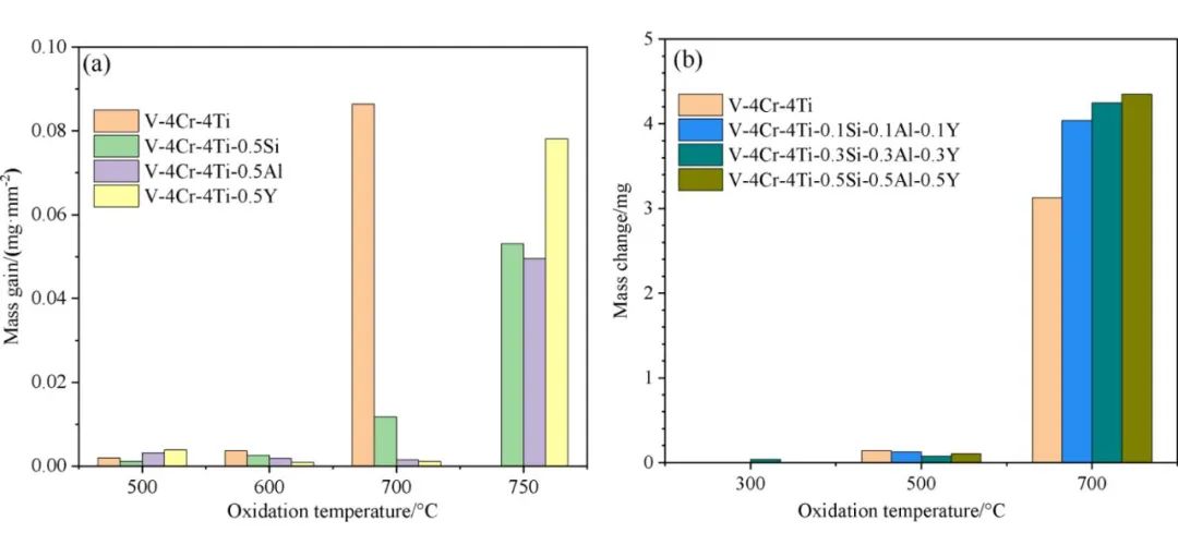 研究表明,无论在空气、高纯He还是高真空气氛中,Si元素均有助于降低V-Cr-Ti合金在500 ℃及以下温度区间的氧化增重行为,Y元素则可显著提高V-Cr-Ti合金在600~700 ℃区间的抗氧化性能,而Al元素的添加可以提高V-Cr-Ti合金在700 ℃的抗氧化性能,如图5所示;但是,当温度进一步提高至750 ℃时,添加Al、Si或Y元素的V-Cr-Ti合金均发生严重的氧化增重行为,其中V-Cr-Ti-Y合金的氧化增重最高,这是因为V-Cr-Ti-Y合金在700 ℃时会形成结构较为致密的VO2表面氧化层,而在750 ℃则会形成结构疏松的低熔点V2O5氧化层,使得大量的氧仍可通过溶解、扩散等方式进入到V-Cr-Ti合金基体内部,并会导致合金显著变脆。当同时添加Al、Si和Y元素时,V-4Cr-4Ti-(0.1-0.5)Si-(0.1-0.5)Al-(0.1-0.5)Y合金在不同氧化温度下的质量变化与V-4Cr-4Ti合金均相差较小,即同时添加上述三种元素并未显著提升V-4Cr-4Ti合金的抗氧化性能,如图5所示。另有研究表明,添加Cr、Al、Si等元素还会增加钒合金的氢致脆化敏感性。因此,抗氧化性元素的添加是否会对合金的力学性能造成较大的损害也需要充分的研究。