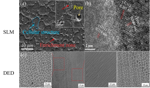 SLM制备的316L不锈钢,在熔池中心的组织呈现等轴晶,熔池边界则呈现长条状晶粒,组织形貌通常归因于冷却速度,冷却速度越快,凝固后微观结构发生从平板状到胞状再到树枝状的转变,晶胞具有各向异性。