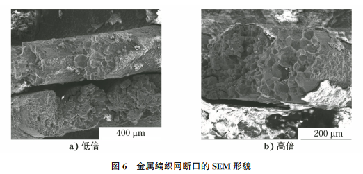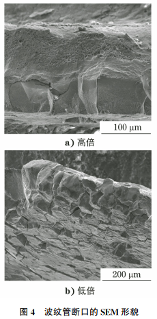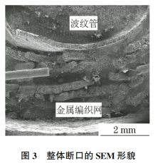 将断口试样清洗后,置于扫描电子显微镜下观察,其形貌如图3所示,断口包括波纹管与金属编织网两部分。