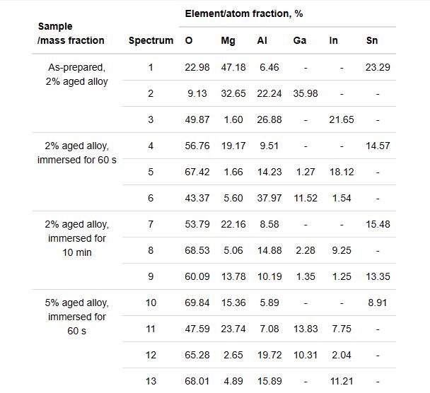 晶界相与铝基体间ΔVPD,是影响阳极溶解的重要因素。ΔVPD绝对值越大越有利于阳极晶界相溶解,即Ga、In、Sn更容易从晶界相中析出。时效态合金晶界相与铝基体间ΔVPD的绝对值大,因此时效态合金晶界相中的Ga、In、Sn更容易析出。