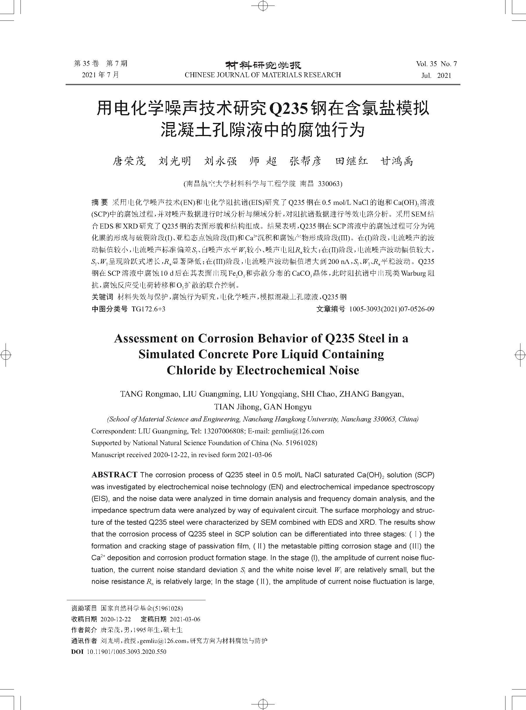 用电化学噪声技术研究Q235钢在含氯盐模拟混凝土孔隙液中的腐蚀行为