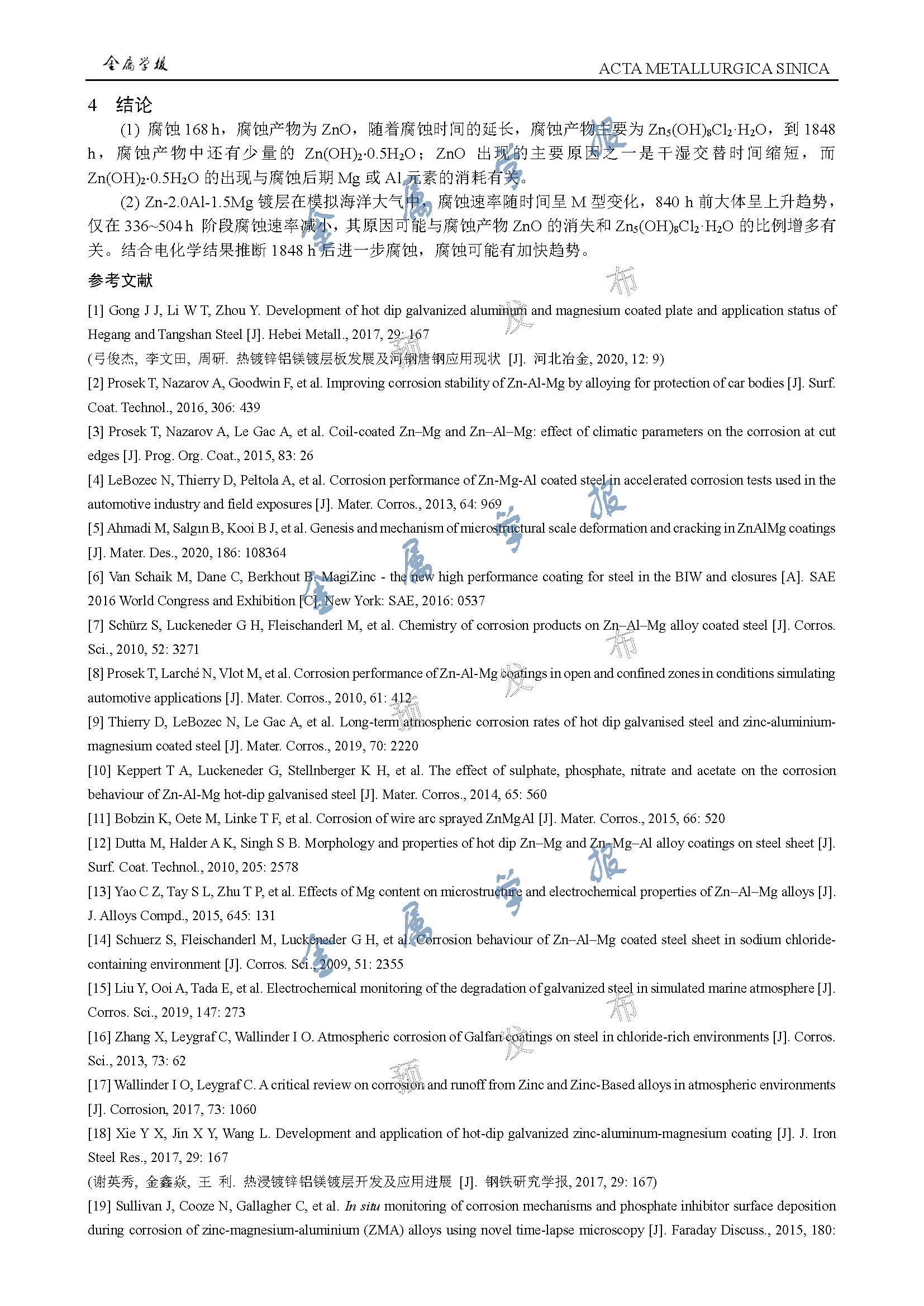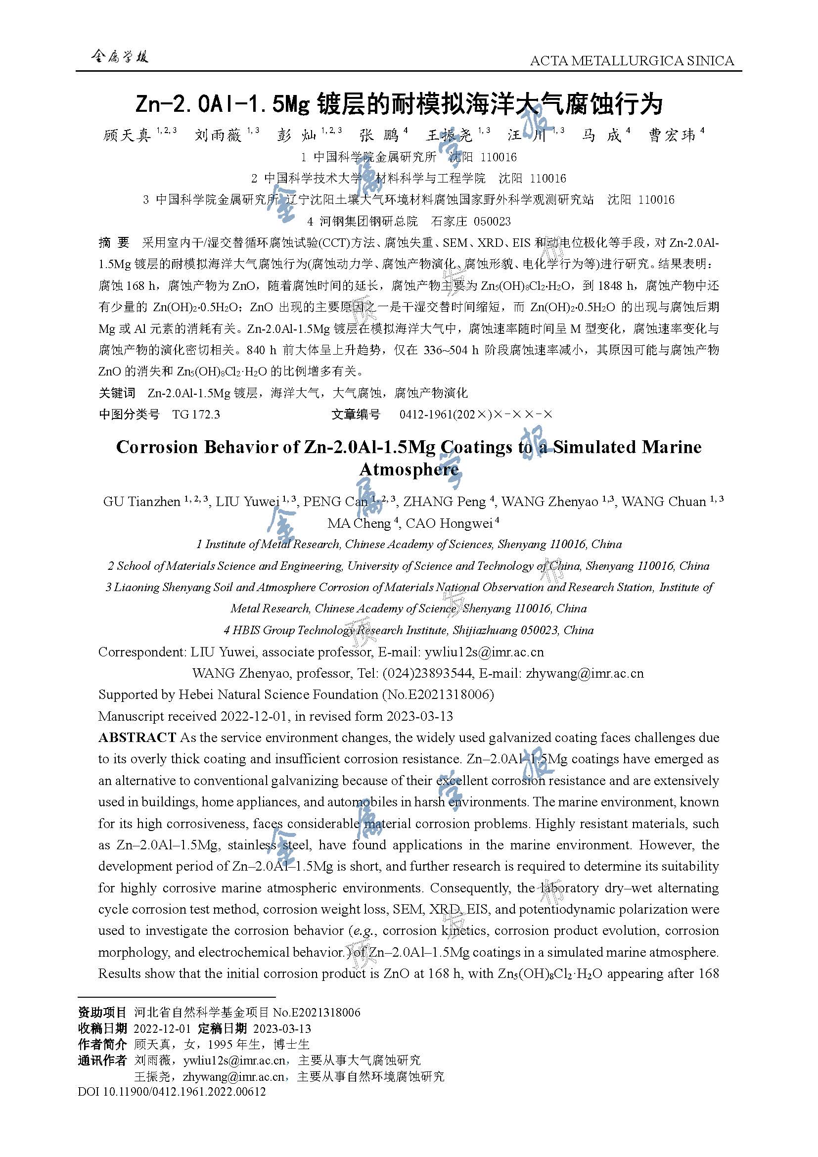 标签: Zn-2.0Al-1.5Mg镀层, 海洋大气, 大气腐蚀, 腐蚀产物演化