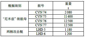 1)“尼米兹”级航母“尼米兹”级航母是目前世界上最先进的大型航空母舰,也是美国海军现役航母的主要构成部分,共造10 艘。该级航母首舰“尼米兹”号于1968 年开始建造,1975 年3 月服役,到2008 年已经有9艘“尼米兹”级核动力航母在役;其最新的“乔治?布什”号(CVN 77)于2006 年下水,2009 年初服役。CVN 77 核动力航母总长332.9 m, 宽40.8 m,吃水11.3 m, 满载排水量102 000 t; 飞行甲板长332.9 m,斜角甲板长237.7 m,宽76.8 m;机库甲板长208.48 m,宽32.92 m,机库净高8.07 m;最大航速可达30 kn。