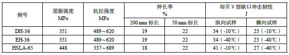 HSLA-65 钢的化学成分与HTS 钢相似,采用电炉冶炼,氩—氯脱碳精炼,真空脱氧,加钙处理以控制夹杂物形成,控扎;其板厚可达51 mm,机械性能、韧性均能满足舰艇用钢的要求。表3 是这几种钢的机械性能。