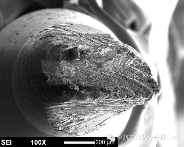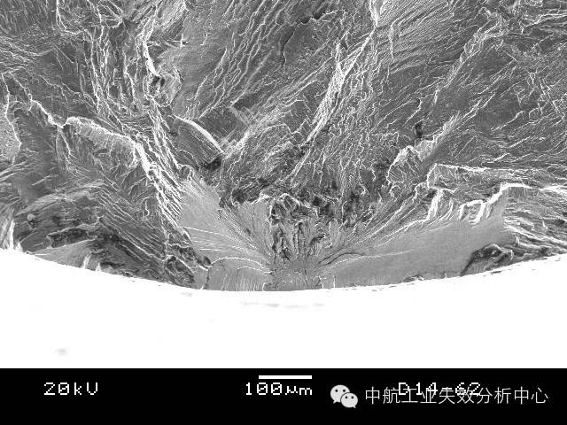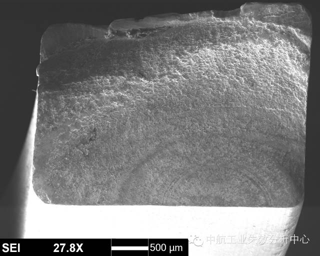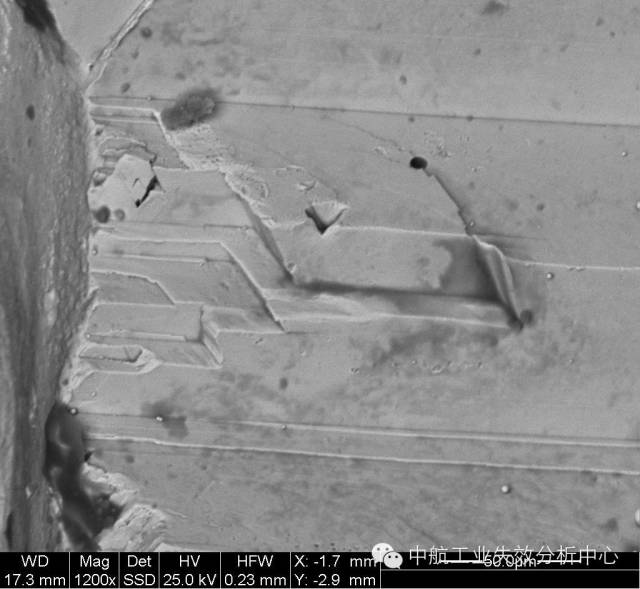 材料在受到低于断裂强度的交变应力作用下,发生的脆性断裂,称之为疲劳,常可见疲劳条带(或称疲劳辉纹)的典型特征。 对于疲劳源区而言,最简单的是收敛类源区: 源区附近呈放射性,其收敛位置即为源区。 源区附近呈弧线式,其圆心位置即为源区。 这类源区附近的断面一般较为平坦,之后断面的起伏度和粗糙度均会增大。收敛类的疲劳起源占疲劳失效的较大比例,另一种情况,疲劳源区则为解理面或准/类解理面交错,常见于铜合金和高温合金,部分钛合金也有该情况。 高温合金源区的解理特征 铜合金源区的类解理特征 钛合金源区的解理特征 这类的源区附近断面由于交错分布多个解理面,因此比较粗糙,之后的疲劳扩展前、中期则会转为平坦,最后失稳后的快速扩展又重新变得起伏大和粗糙。此外,有些疲劳并不一定从试样表面起源,有可能在试样内部,此时往往可能由于内部存在缺陷或亚表面处于特殊应力状态导致。 有的起源也不仅仅在一处位置起源,可能在多个位置均萌生疲劳源,这时我们就可以看到多个疲劳源之间产生类似台阶的特征,这是由于多处萌生裂纹并扩展过程中,不可能在一个平面上扩展,当裂纹相互交汇到一起时,必然通过剪切撕裂的方式使不同的扩展平面连接起来,从而形成台阶。 试样边缘多个交汇台阶 以上说了这么多,大家是不是反而晕菜了?怎么好像什么模式都有,我们到底应该如何判断? 首先,当然是通过棱线的收敛去判断,毕竟绝大多数的疲劳都有该特征。 其次,看看是不是铜合金、高温合金这种特殊的合金,对于他们来说,找解理面就差不多了。 再次,关注台阶,台阶必然意味着有多条裂纹交汇在一起,也就是说,一个台阶的两侧存在源区的可能性很大。 然后,我们还有几个辅助判断的手段: 第一,条带方向。几乎所有的疲劳断裂都可以观察到条带特征,此时,条带弧线的圆心位置,就是指向源区了。但是,需要注意的是,条带只是极微观的特征,而且在局部位置由于应力改变,可能造成条带扩展方向转变的情况。因此,该方法只能作为辅助判别手段。 第二,瞬断区判别。源区实在不好找,可以先去找瞬断区,因为瞬断区往往以韧性断裂模式为主,一般可见与疲劳区不同的韧窝特征。此外,瞬断区由于主要在剪切力作用下快速断裂,一般与主断面存在一定的倾斜角度,比较好辨别。找到瞬断区后,与之相对的位置一般就是源区了。 该断口左侧即为瞬断区,由此推出右侧为源区 看到这儿,大家是不是觉得又明白了一些呢?那么下面我们来检验一下自己吧:请问下图断口的源区在哪?有几处源区?