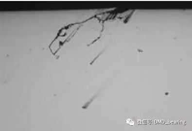 轴承零件在磨削加工中,由于砂轮进给量太大、砂轮轴跳动、切削液供给不充分及砂轮磨粒钝等,均易使零件产生磨削裂纹。另外,热处理时淬火温度过高而造成零件的组织过热、晶粒粗大,残余奥氏体量较多、有网状和粗大颗粒。 磨削缺陷的磁痕一般呈网状、辐射状、平行线状或龟裂状,磁痕细而尖,轮廓较清晰,出现数量多,通常与磨削方向垂直,如图9所示。磁痕多集中分布在中间部位,沿圆周方向,呈长线状或树枝状,局部有分叉,磁痕收敛。 制取裂纹截面金相试样后观察,裂纹较细,垂直于表面,其内未见材料夹杂、氧化皮等异物分布,形貌如图10所示。 图9 原材料裂纹 图10 原材料裂纹处夹杂物形貌