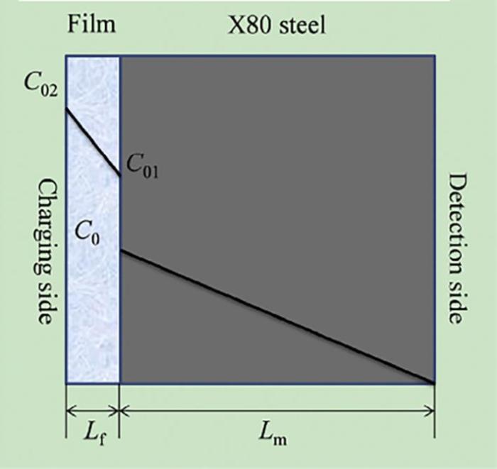 充氢介质不同,试样表面状态对氢吸附的影响也不同:气相充氢时,试样表面粗糙,“活化分子”增多,氢的吸附系数升高,促进原子氢的渗入,氢渗透通量升高;而液相充氢时,粗糙的试样表面会促进氢原子的重新结合,使得氢渗透通量降低[28]。氢渗透试验前,通常会对样品进行打磨、抛光,但不同的预处理方法会产生不同的表面状态。将退火后的工业纯铁采用砂纸打磨至600#、砂纸打磨至600#后化学抛光两种不同的试样制备方法所测得的氢扩散系数差别较大[45],前者扩散系数小于后者,证明粗糙试样表面会抑制液相氢的吸附。除此之外,表面膜也会影响氢渗透行为。电化学氢渗透过程中,金属表面的氧化膜不断变化,表面粗糙度也随之变化,故而影响试样的氢渗透行为[46]。氢渗透试验过程中应考虑氢与金属表面膜的交互作用对氢渗透行为的影响。一般来说,氧化膜起到物理屏障作用,降低氢渗透通量。图2显示了表面存在氧化膜时氢浓度沿试件厚度方向的分布。Zhang等[47]采用高温氧化、发黑处理以及浓硫酸钝化等方法在X80钢表面制备不同的氧化膜,通过电化学氢渗透法研究了氧化膜对X80氢渗透行为的影响,表明三种方法制备的氧化膜都会抑制氢渗透。在此基础上,李贝贝等[48]通过控制氧化温度在X80钢表面制备氧化膜,X80钢在300 ℃氧化得到均匀致密Fe3O4氧化膜;在400 ℃氧化得到的氧化膜由Fe3O4和Fe2O3构成,且氧化膜内存在着微孔和微裂纹;在500和600 ℃氧化时,由外层的Fe2O3和内层的Fe3O4构成,外层Fe2O3膜层中存在少量的微孔。同时,随着氧化温度升高,膜层变厚。他们通过氢渗透试验,表明氧化膜对氢渗透的抑制效果受氧化膜厚度和膜结构的共同影响,300和500 ℃氧化得到的氧化膜阻氢性能最好。