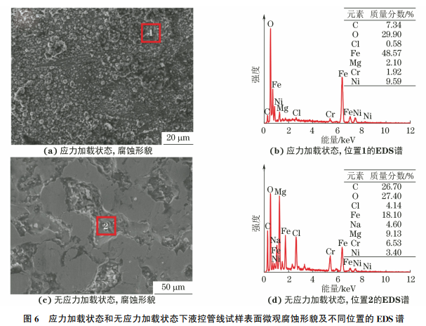由图7可以看出,在酸洗后应力加载状态下试样表面出现明显的径向裂纹,无应力加载状态下试样表面较平整,未发现裂纹。这表明,应力加载能够促进液控管线表面裂纹的形成,并加快液控管线的腐蚀失效。
