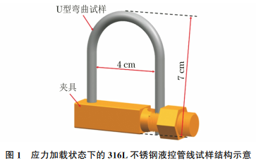 试验材料为某海上稠油热采井用316L不锈钢液控管线,管外径为6.35mm,内径为3.75mm,壁厚为1.3mm,其化学成分(质量分数%)为0.03C,0.75Si,2.00Mn,0.045P,0.03S,16.70Cr,10.02Ni,2.03Mo,0.10N,余Fe。为研究应力加载对液控管线在热采服役环境中腐蚀损伤的影响,分别制备应力加载和无应力加载2种状态的试样,其中:应力加载状态下的试样是按照GB/T 15970.3—1995用两步法制作的U 型弯曲试样,其结构如图1所示;无应力加载状态下的试样为长度10cm的直管试样。