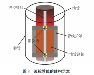 液控管线通过管线护罩上的限位槽限位在油管接箍上,如图2所示。在高温环境中液控管线受热发生热膨胀,由于油管接箍与液控管线的热膨胀系数不同,且管线护罩对液控管线有限位作用,阻碍液控管线的热膨胀释放,因此在实际生产过程中液控管线会产生沿轴向的热应力,同时也会产生一定的弧度。316L不锈钢在室温(25℃)以及200,260,300,350℃时的屈服强度分别为276,230,215,205,193MPa,泊松比约为0.3。316L不锈钢与N80油管钢(油管接箍材料)的弹性模量和热膨胀系数见表1。油管接箍外壁与套管内壁间距为液控管线在环空中弧的最大变形范围。热采井用套管的内径为205.7mm,外径为219.1mm,通径为202.5mm;油管的内径为100.3mm,外径为120.6mm;接箍外径为141.5mm。由此可以确定,液控管线在环空中弧的最大变形范围为32mm,即模型的最大变形弧的高度为32mm。