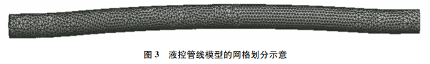 根据实际油管长度,定义这段带有弧形的液控管线弦长为10000mm,外径为6.35mm,内径为3.75mm,两端受液控管线护罩约束的部位保持直线,端部直管段长200mm,中部弧的高度为32mm。考虑到液控管线长径比过大,为减小计算误差和提高网格划分精度,按照尺寸10∶1比例建立液控管线模型并利用AnsysWorkbench软件对其热应力进行有限元计算。对模型两端直管段进行完全固定约束,使其自由度为0,对中部位置进行位移约束。由于液控管线的管径较小、管壁较薄,为保证有限元计算结果的准确性及合理性,在网格划分时,采用全局单元尺寸控制网格大小,网格单元为四面体单元,如图3所示。