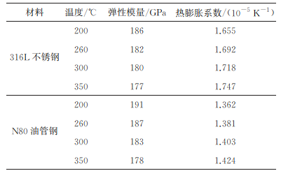 表1 316L不锈钢与 N80油管钢的热膨胀系数和弹性模量
